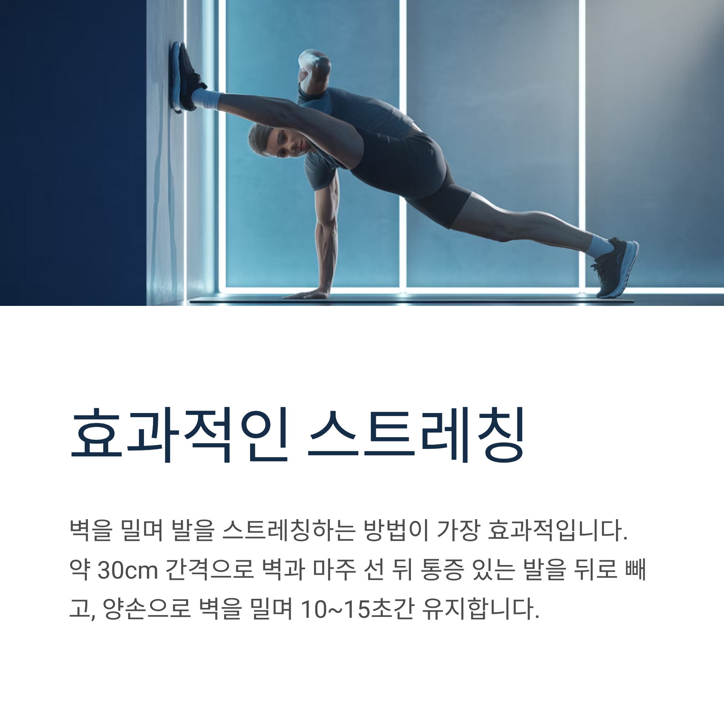 벽을 밀며 발을 스트레칭하는 방법이 효과적입니다. 약 30cm 간격을 두고 벽과 마주 선 뒤 통증이 있는 발을 최대한 빼고, 양손으로 벽을 밀며 10~15초간 자세를 유지합니다. 이때 발바닥 전체가 바닥에 닿아야 하며 발바닥이 당겨지는 느낌이 들어야 합니다.