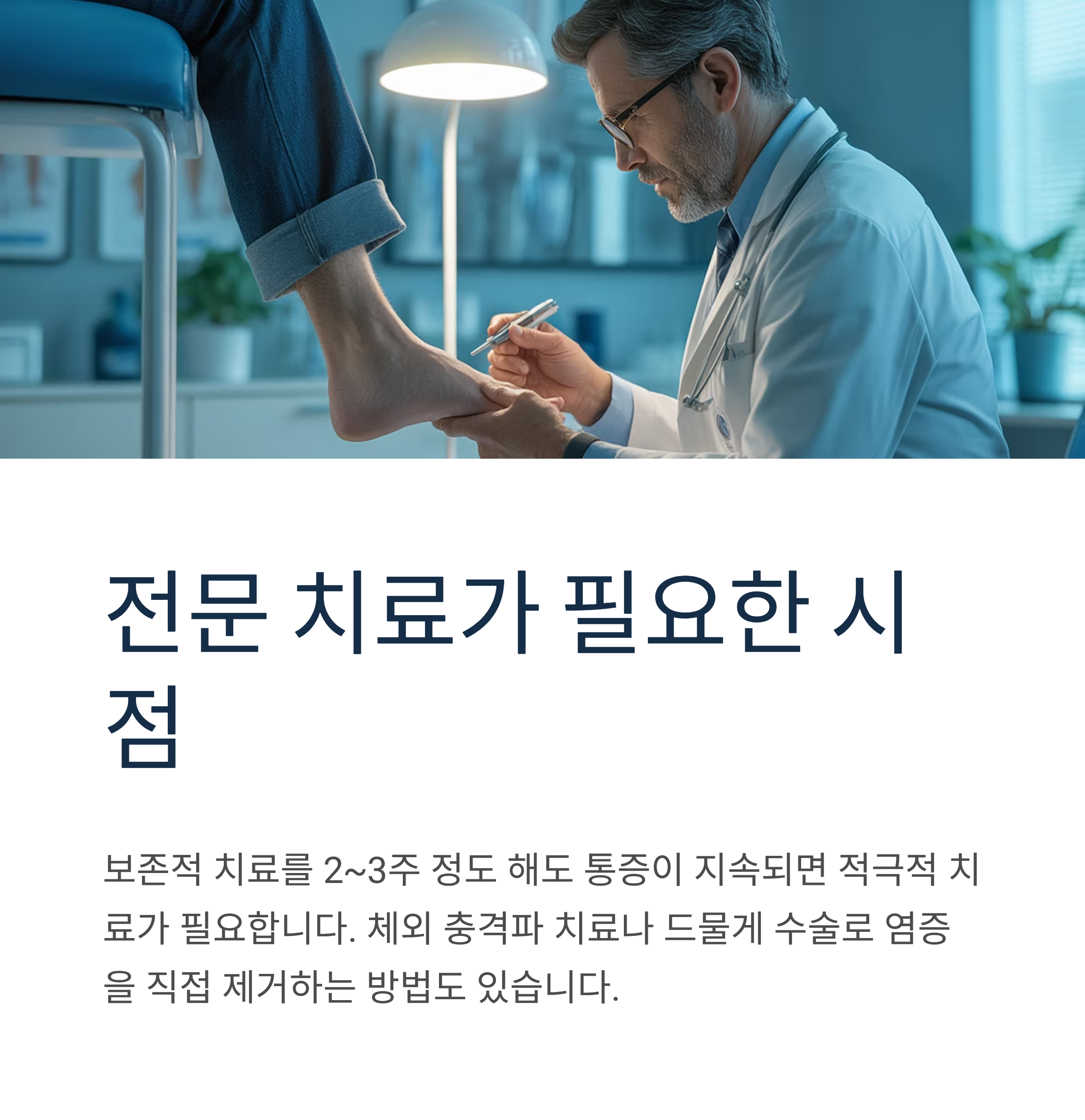 발뒤꿈치 통증이 2주 이상 지속되거나 일상생활에 지장을 준다면 반드시 정형외과 전문의의 정확한 진단을 받으시기 바랍니다.