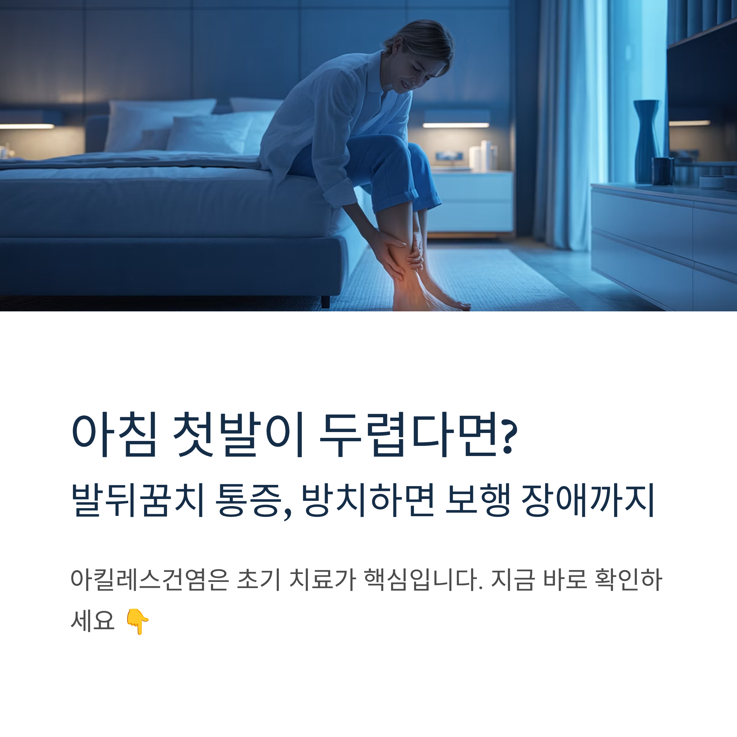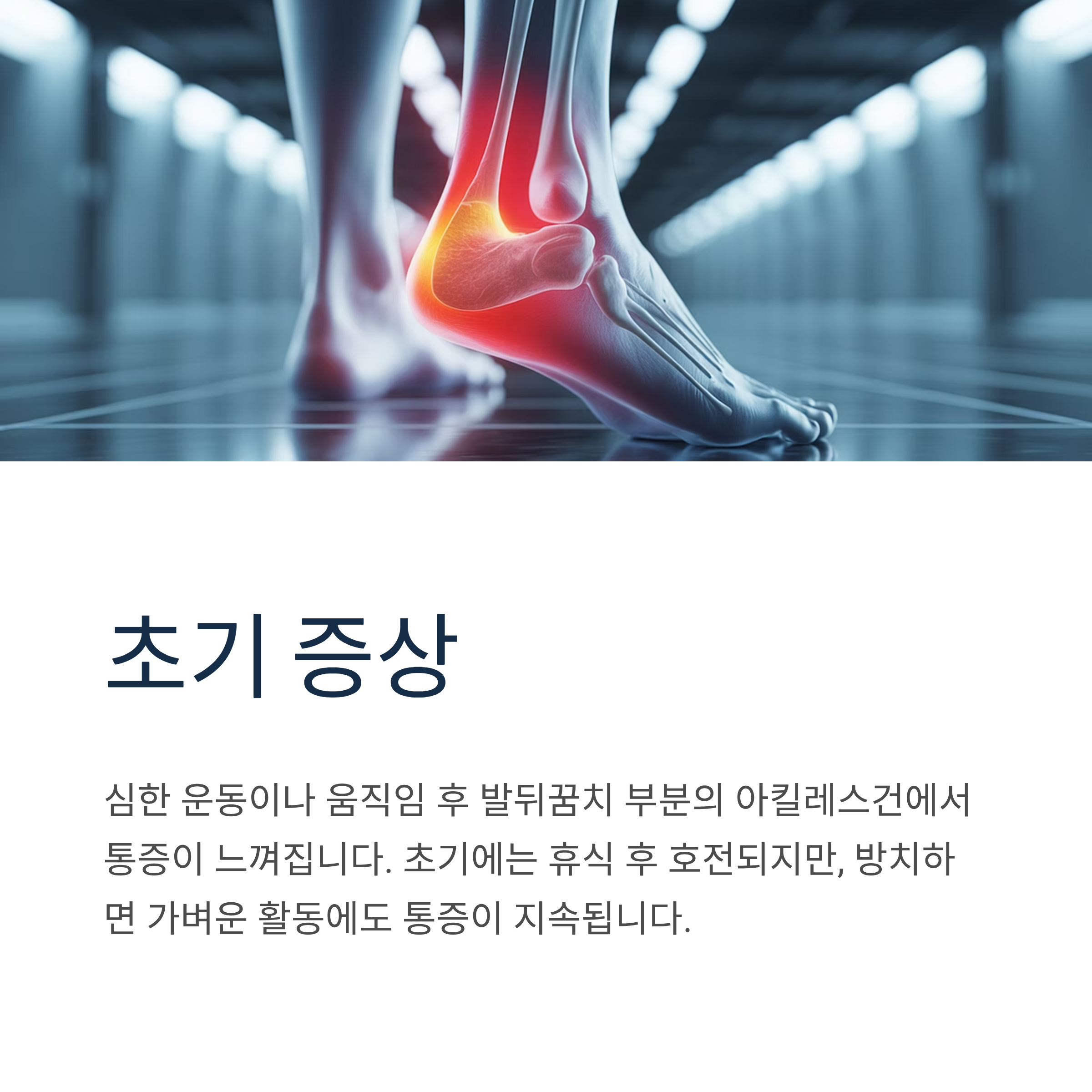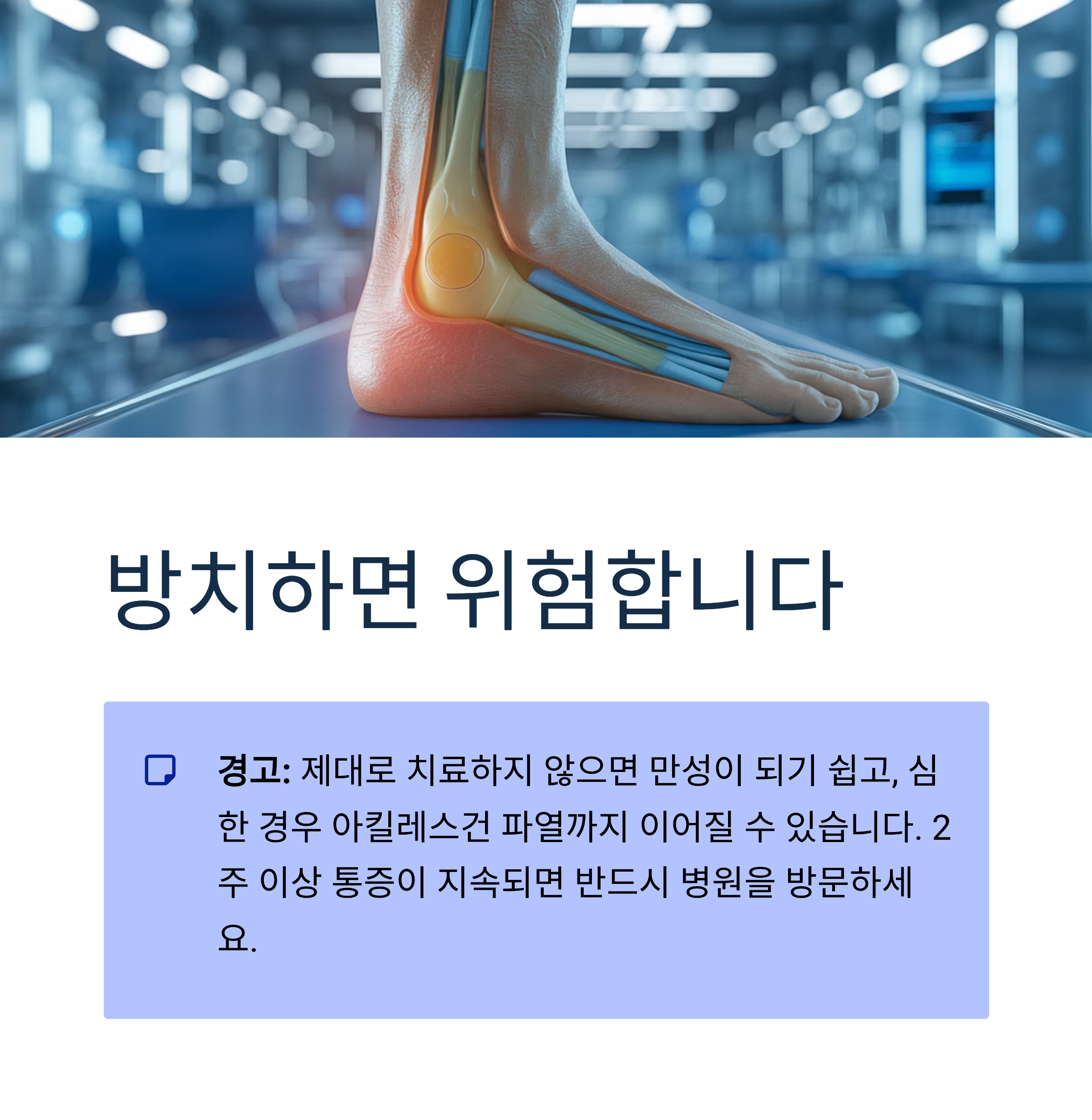아킬레스건 통증은 초기 대응이 가장 중요합니다. 제대로 치료하지 않으면 만성이 되기 쉽고, 심한 경우 아킬레스건 파열까지 이어질 수 있습니다.