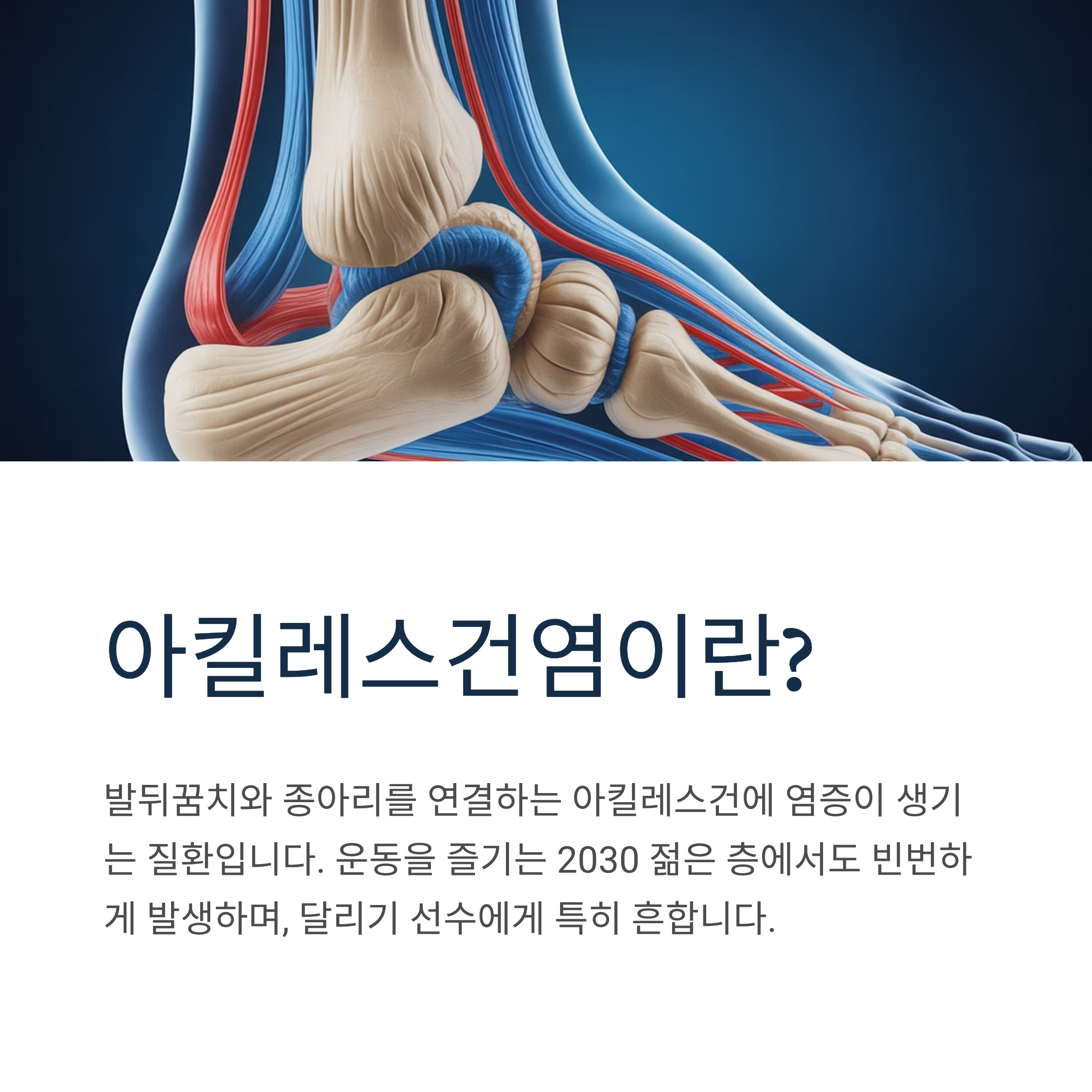 아킬레스건염은 초기에 제대로 치료하지 않으면 만성이 되기 쉬워 조기 발견과 치료가 무엇보다 중요합니다. 특히 운동을 즐기는 2030 젊은 층에서도 빈번하게 발생하는 질환으로, 달리기 선수에게 매우 흔하게 나타납니다.