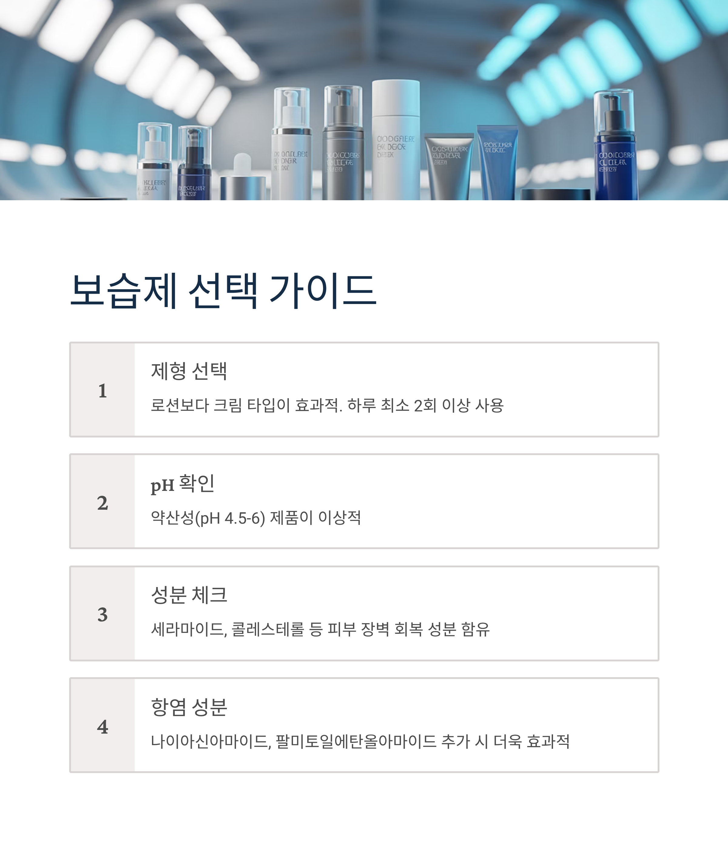 세라마이드, 콜레스테롤 등 피부 장벽 회복 성분이 함유된 약산성(pH 4.5-6) 보습제가 이상적입니다. 나이아신아마이드, 팔미토일에탄올아마이드 같은 항염 성분이 추가된 제품도 도움이 됩니다.