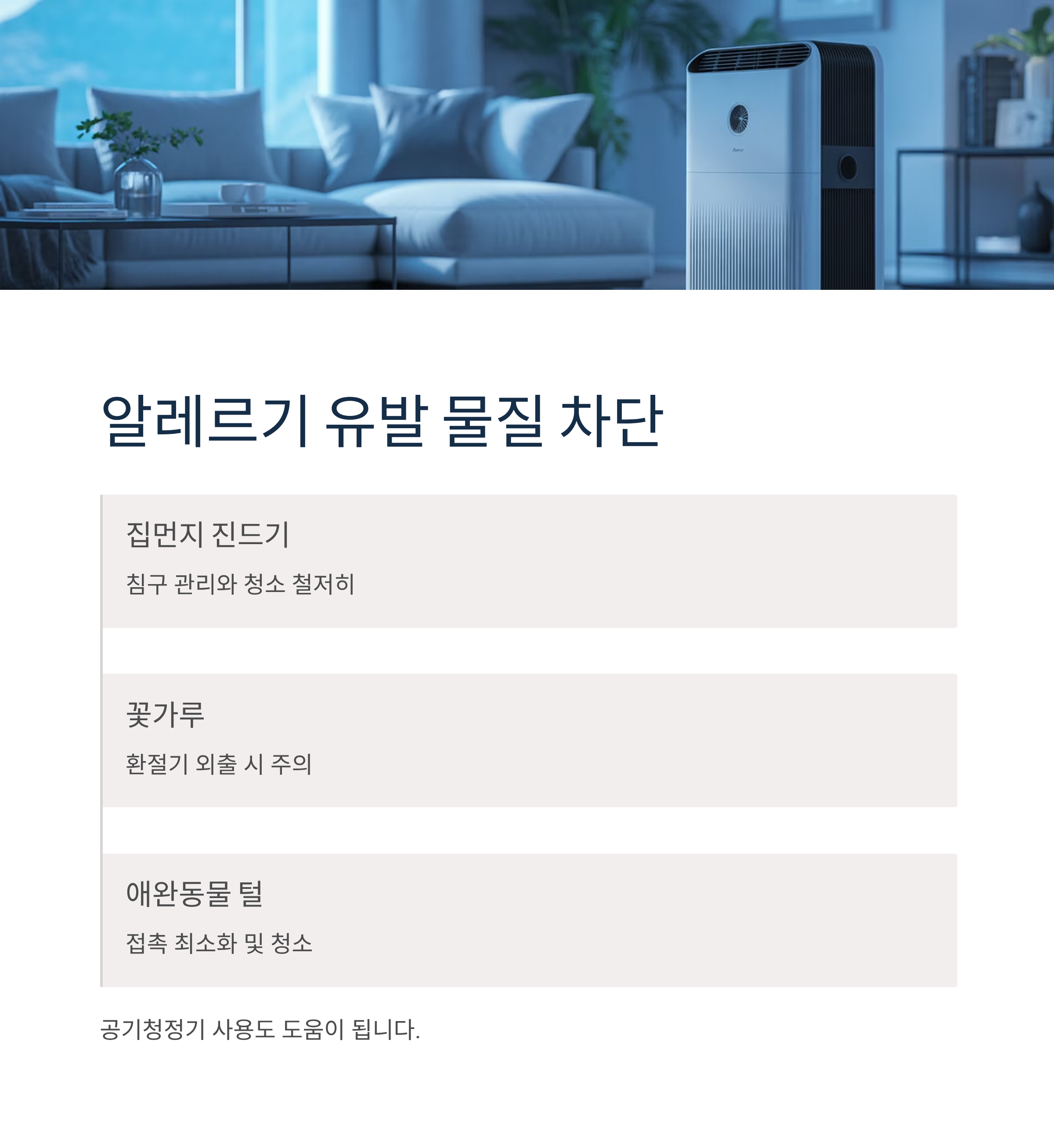 손톱은 짧게 관리하고, 침구류는 일주일에 한 번 이상 세탁합니다. 집먼지 진드기, 꽃가루, 애완동물 털 등 알레르기 유발 물질을 최대한 피하고, 공기청정기 사용도 도움이 됩니다.