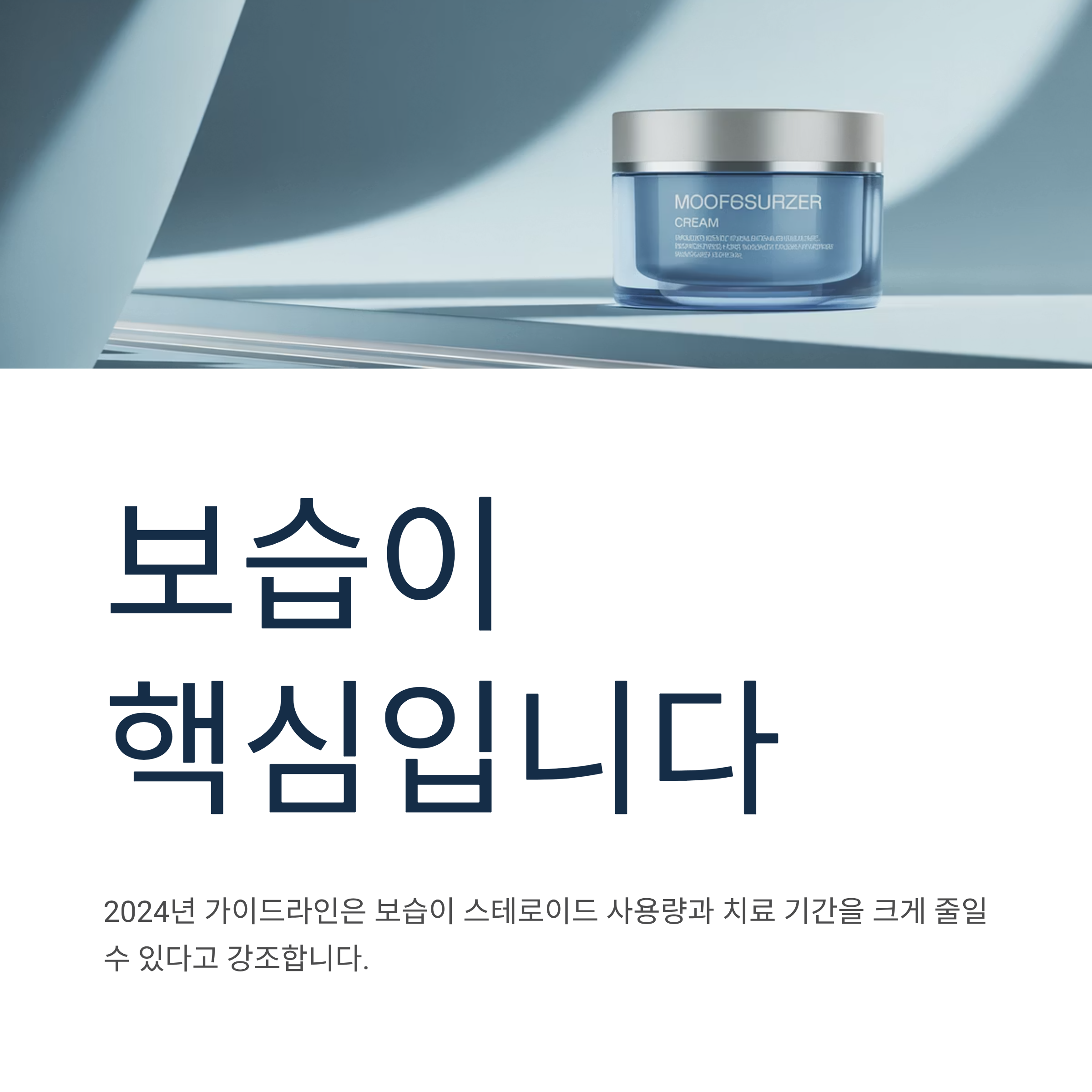 아토피 관리에서 가장 중요한 것은 보습입니다. 2024년 가이드라인은 보습이 스테로이드 사용량과 치료 기간을 크게 줄일 수 있다고 강조합니다.