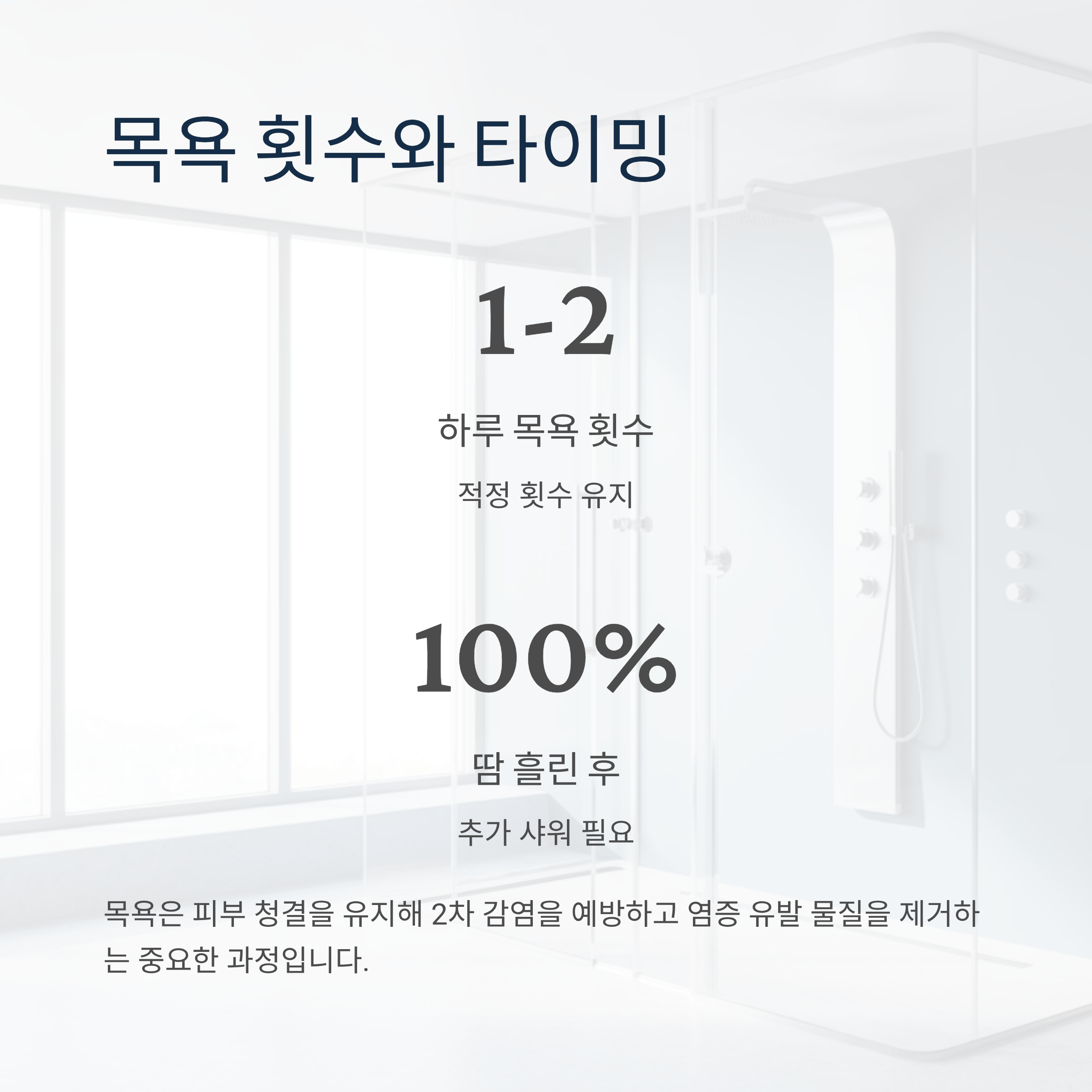 목욕 횟수는 하루 1-2회가 적당하며, 땀을 많이 흘렸다면 추가 샤워가 필요합니다. 목욕은 피부 청결을 유지해 2차 감염을 예방하고 염증 유발 물질을 제거하는 중요한 과정입니다. 목욕 후에는 부드러운 수건으로 두드리듯 물기를 제거한 뒤, 즉시 보습제를 바르세요.