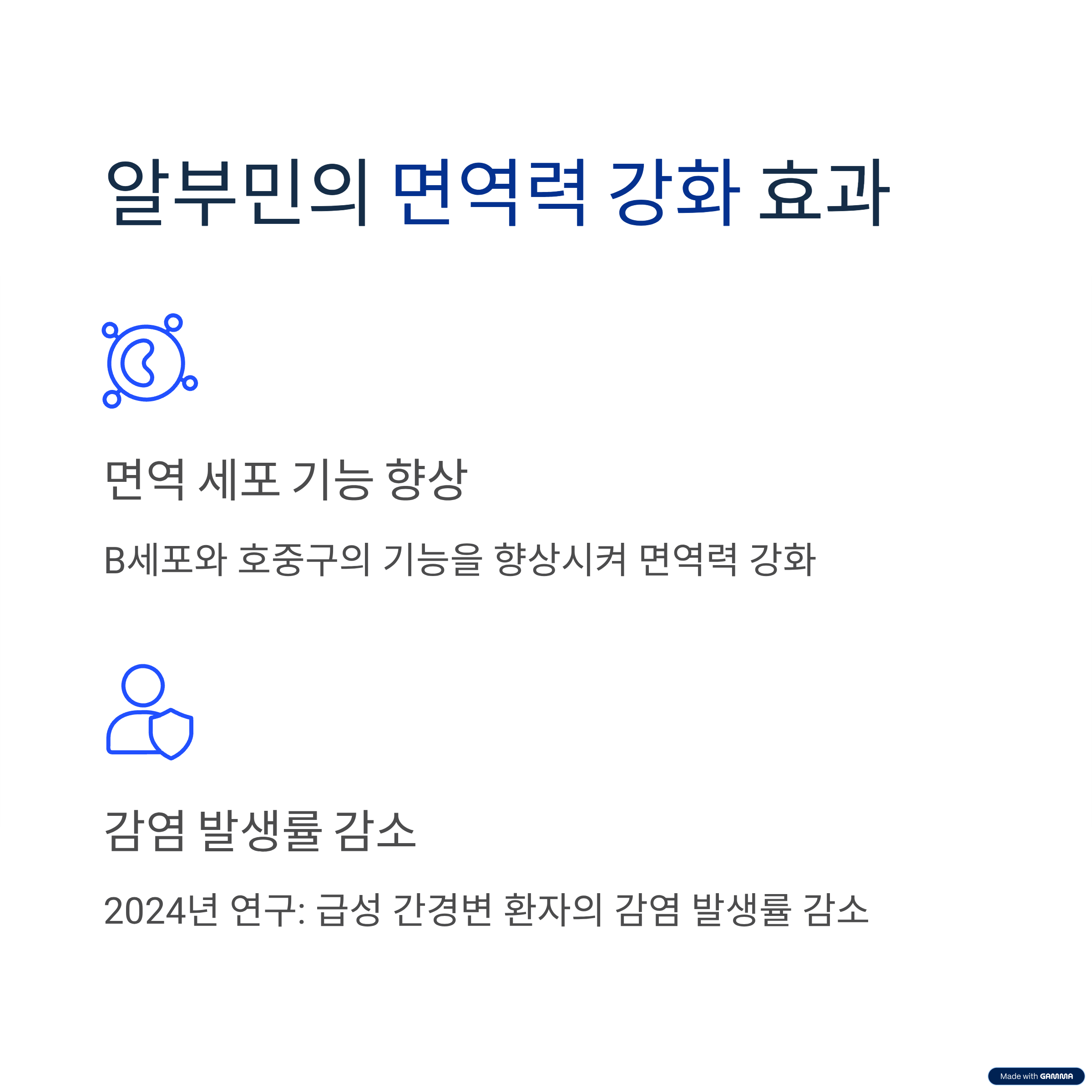 2024년에 공개된 JHEP 리포트 연구결과를 보면, 면역력이 약해진 급성 간경변 환자를 대상으로 알부민을 투여한 결과, 면역 세포인 B세포와 호중구의 기능을 향상시켰으며, 급성 간경변 환자의 감염 발생률을 줄이는 데 도움을 주는 것으로 확인됐습니다.
