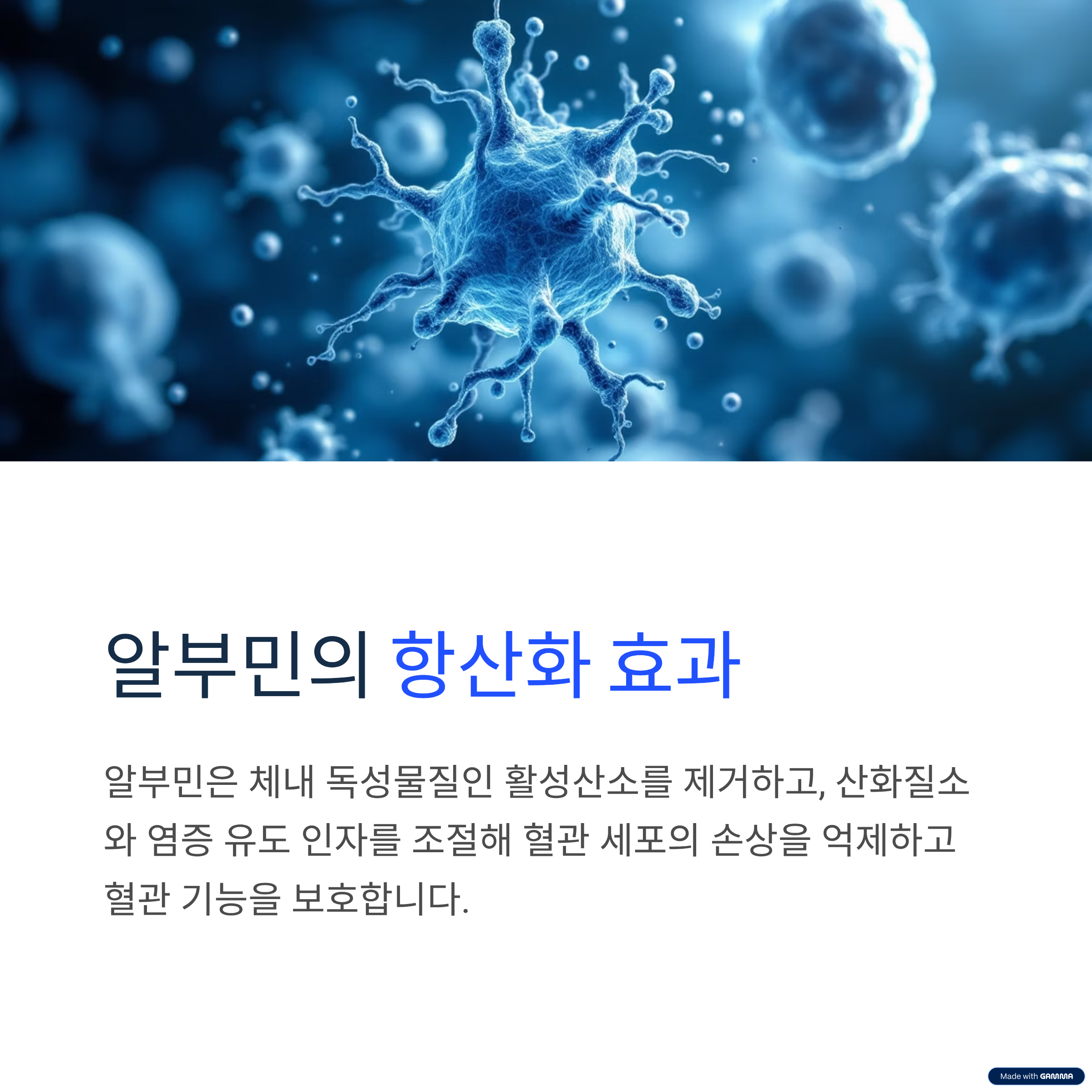 알부민은 항산화 및 항염 작용에도 효능을 냅니다. 체내 독성물질인 활성산소를 제거하고, 산화질소, 염증 유도 인자 등을 조절해 혈관 세포의 손상을 억제하고 혈관 기능을 보호합니다.