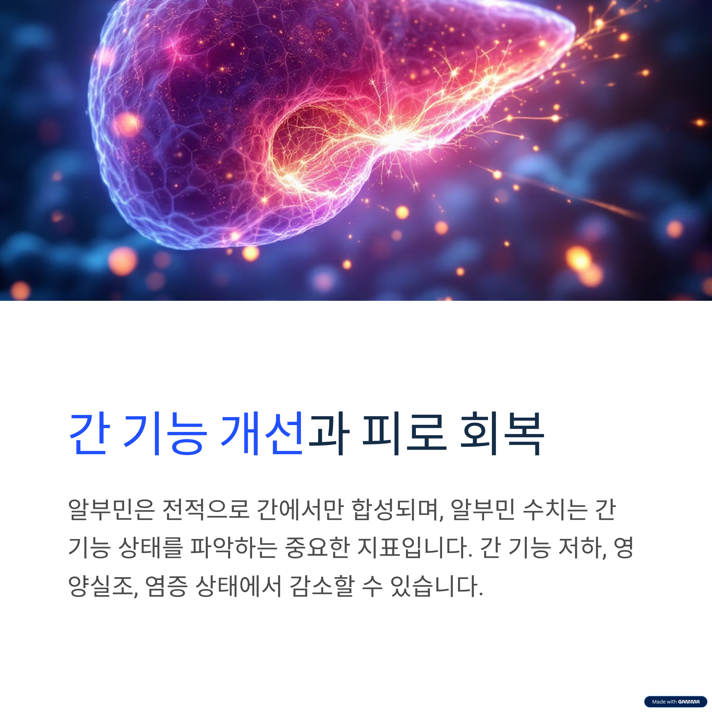 알부민은 전적으로 간에서만 합성되며 알부민의 농도는 간 기능 저하, 신장질환, 영양실조, 염증, 쇼크일 경우 감소할 수 있습니다. 간에서 생성되는 알부민 수치는 간 기능 상태를 파악하는 중요한 지표로 활용됩니다.