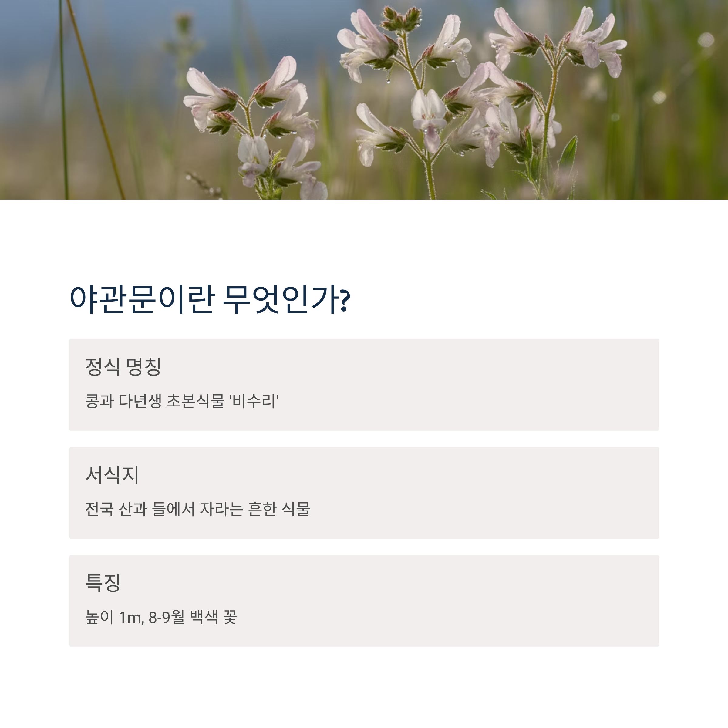 야관문(夜關門)은 콩과에 속하는 다년생 초본식물로, 우리말 이름은 '비수리'입니다. 전국의 산과 들에서 흔히 자라는 이 식물은 높이 약 1m까지 자라며, 8-9월에 백색 꽃이 핍니다.