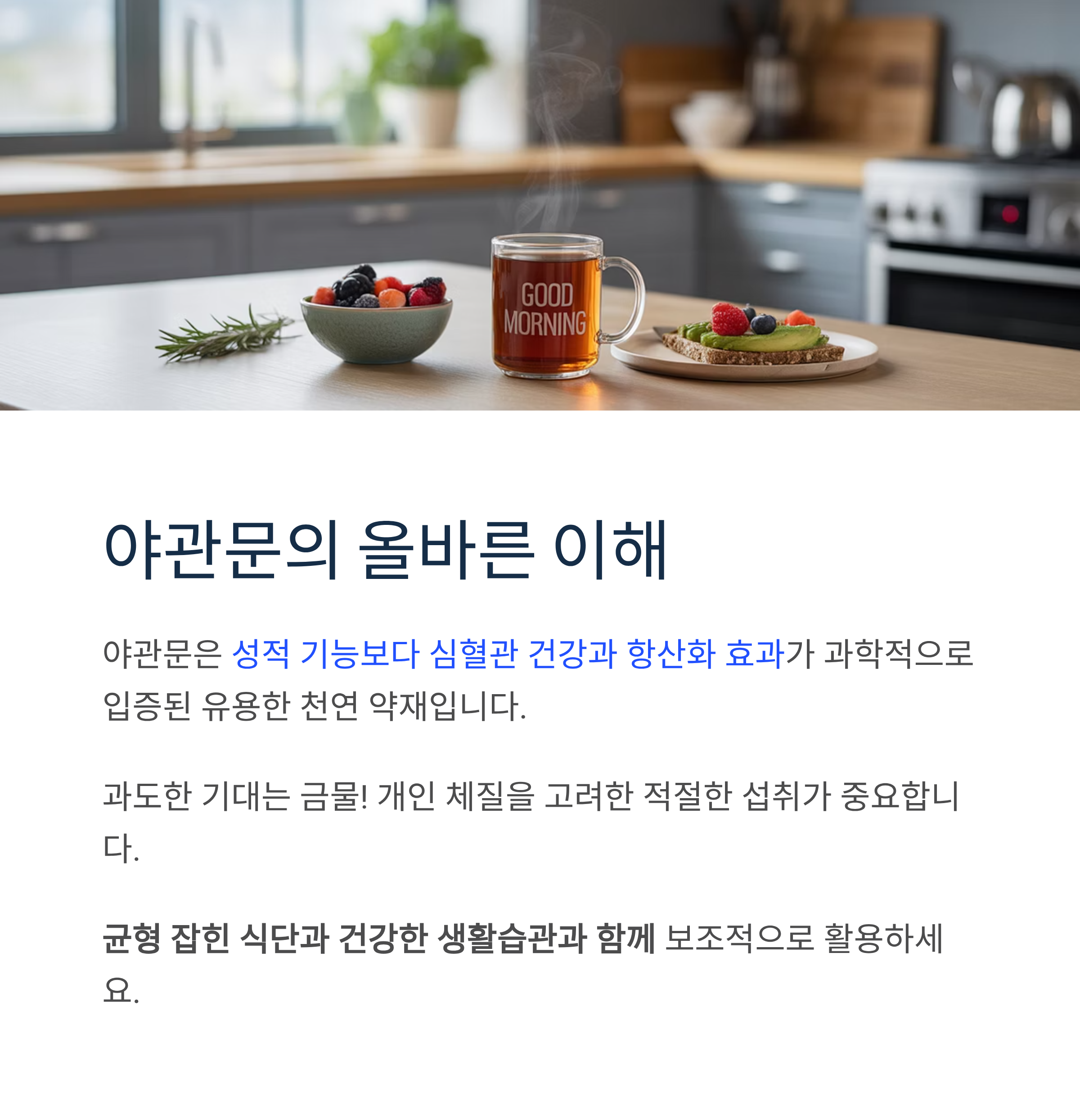 균형 잡힌 식단과 건강한 생활습관과 함께 야관문을 보조적으로 활용할 때, 진정한 건강 관리 효과를 기대할 수 있습니다.