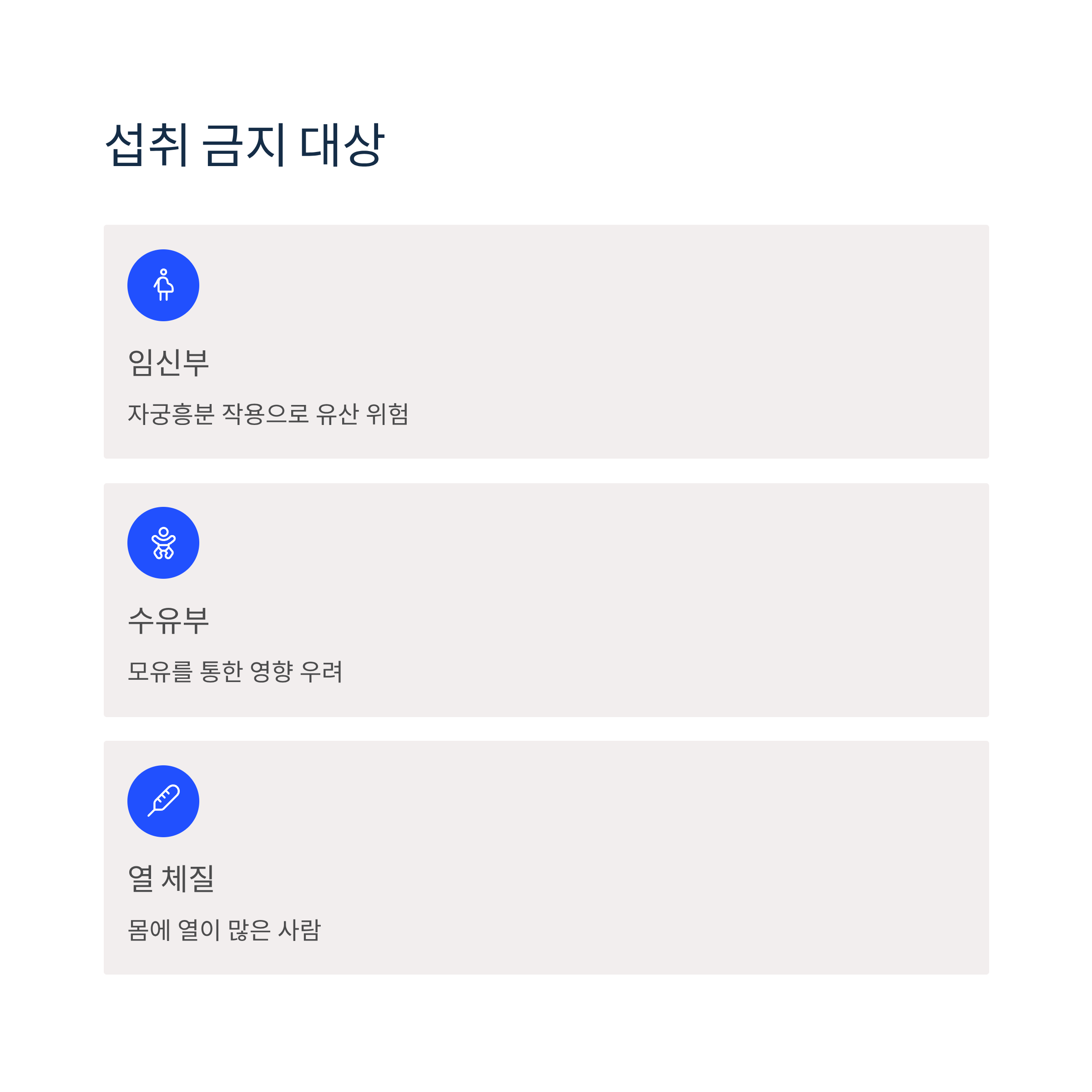 - 임신 중이거나 임신을 준비하는 여성 (자궁흥분 작용으로 인한 유산 위험)