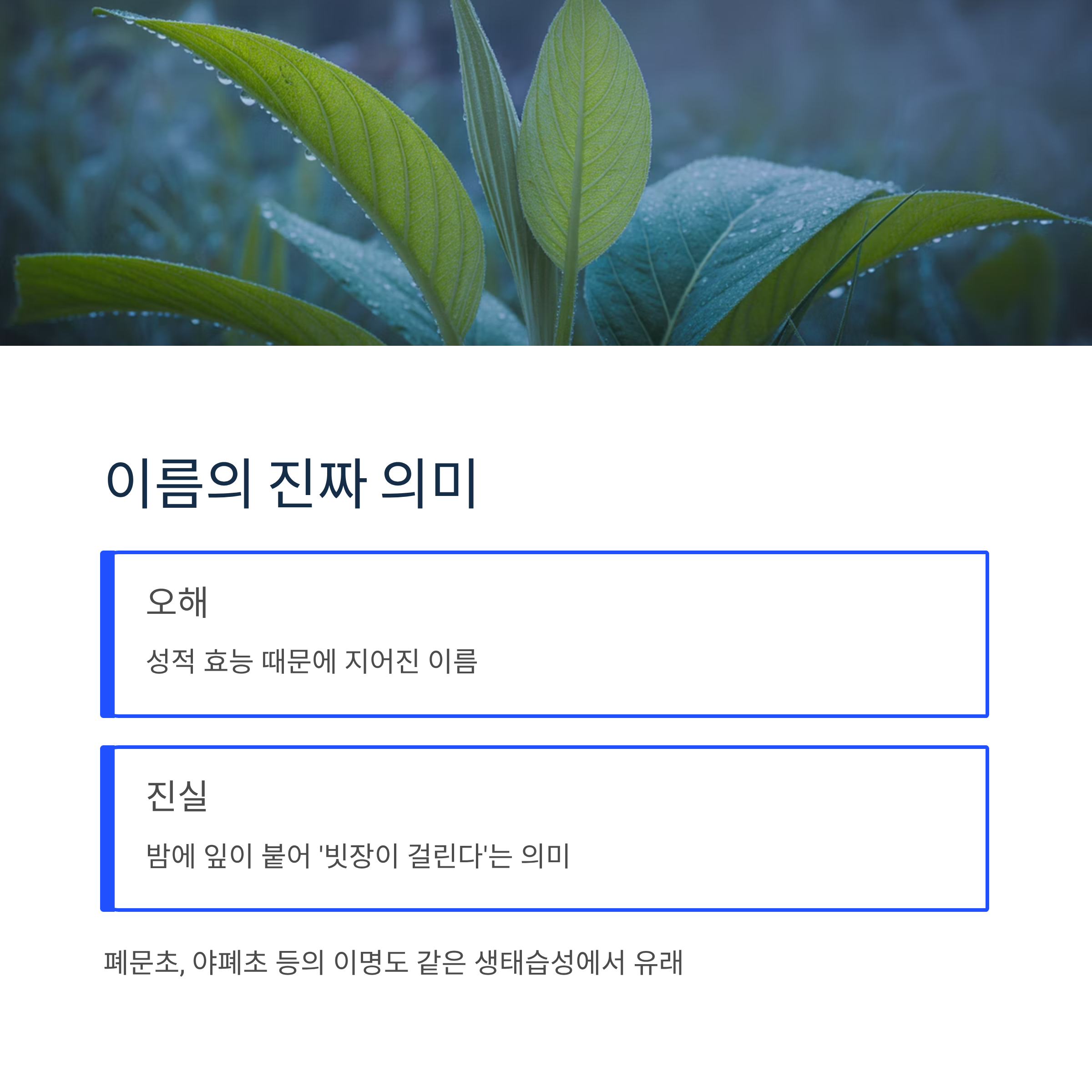 많은 사람들이 야관문의 이름이 '성적 효능' 때문에 지어진 것으로 오해하지만, 실제로는 밤에 잎이 서로 붙어 있는 생태습성에 따라 '밤에 빗장이 걸린다'는 의미로 명명되었습니다. 폐문초(閉門草), 야폐초(夜閉草) 등의 이명도 모두 같은 의미입니다.