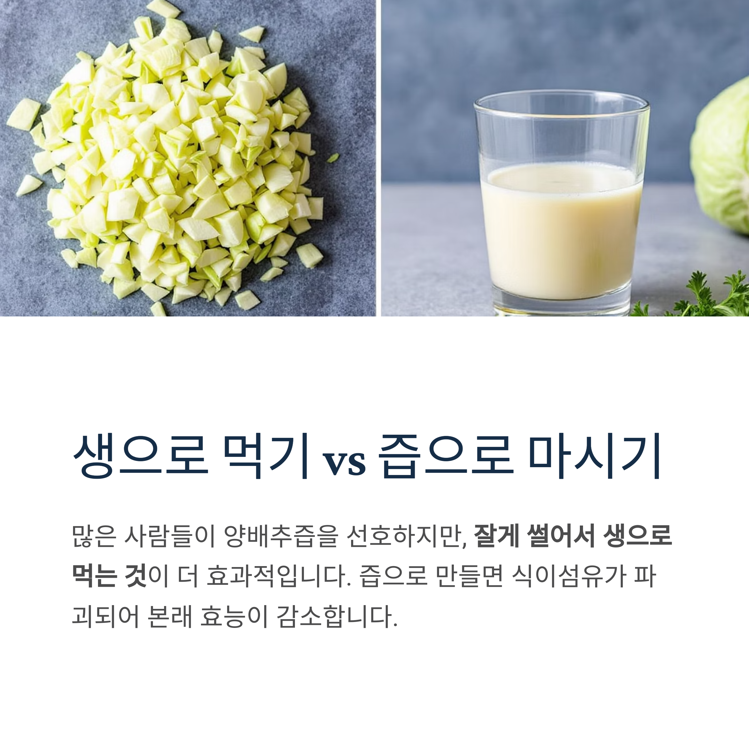 시중 양배추즙은 편의성은 좋지만, 생양배추 대비 식이섬유와 일부 영양소가 부족할 수 있습니다. 가능하면 직접 만들어 먹는 것을 권장합니다.