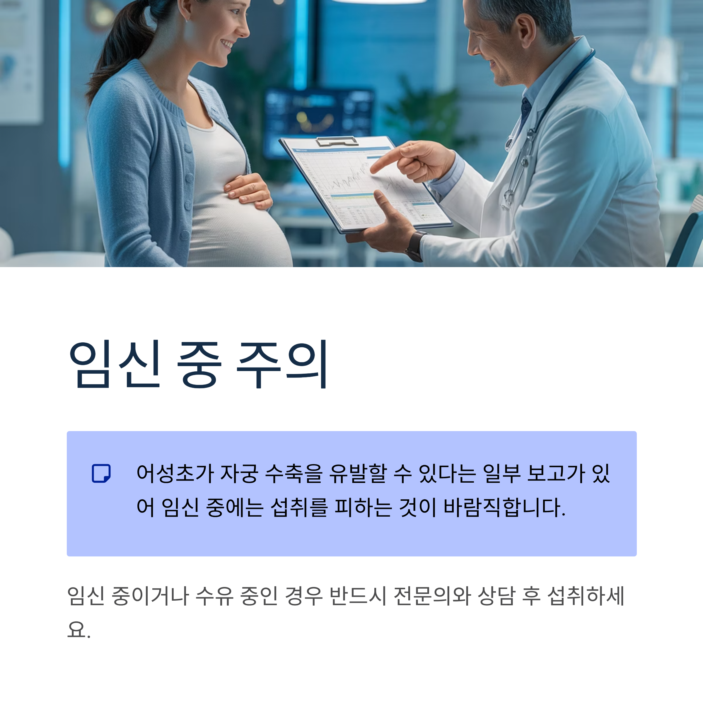 임신 중 주의어성초가 자궁 수축을 유발할 수 있다는 일부 보고가 있어 임신 중에는 섭취를 피하는 것이 바람직합니다.