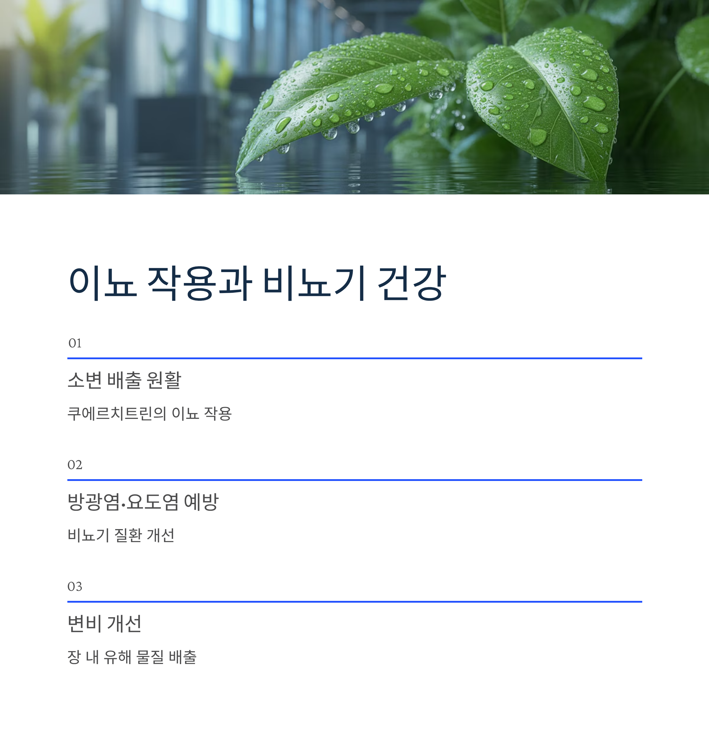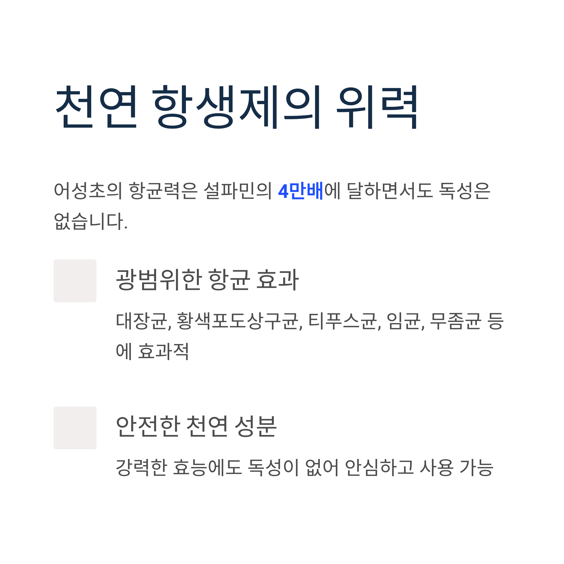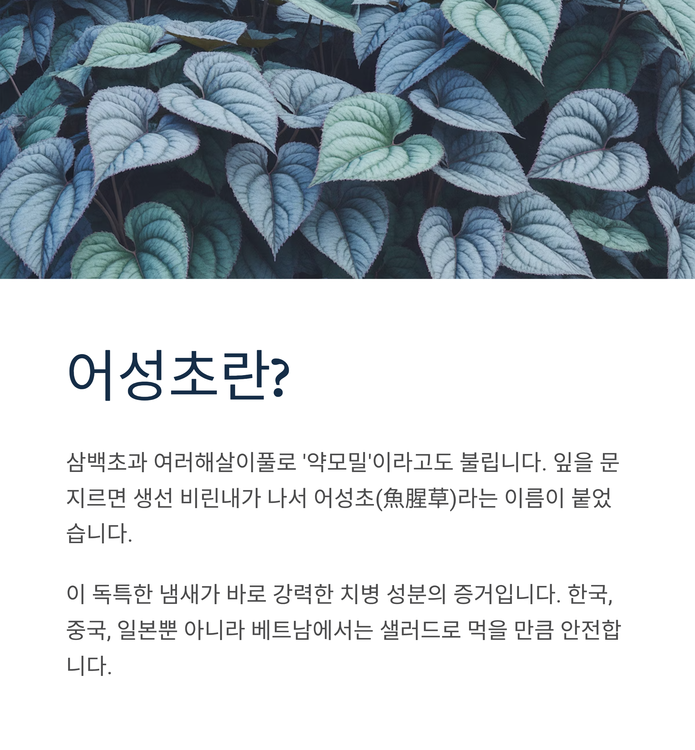 미세먼지, 환경오염, 스트레스 등으로 지친 현대인에게 어성초는 훌륭한 건강 관리 파트너가 될 수 있습니다. 강력한 해독 작용과 항균 효과, 피부 질환 개선 효능은 과학적으로도 인정받고 있습니다.