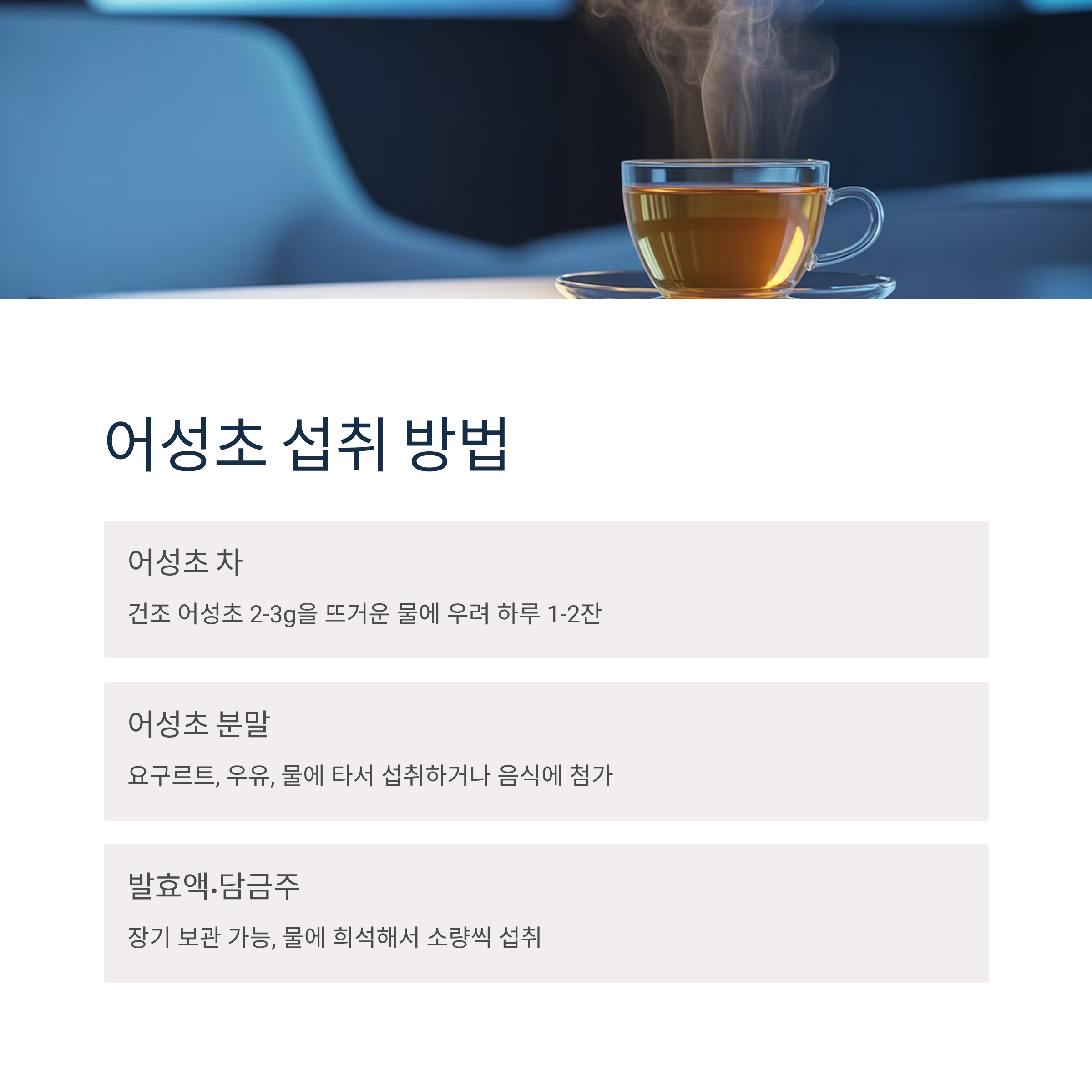 가장 일반적이고 간편한 방법입니다. 건조된 어성초 2~3g을 뜨거운 물에 우려 하루 1~2잔 마십니다. 티백 제품도 시중에 많이 출시되어 있습니다.