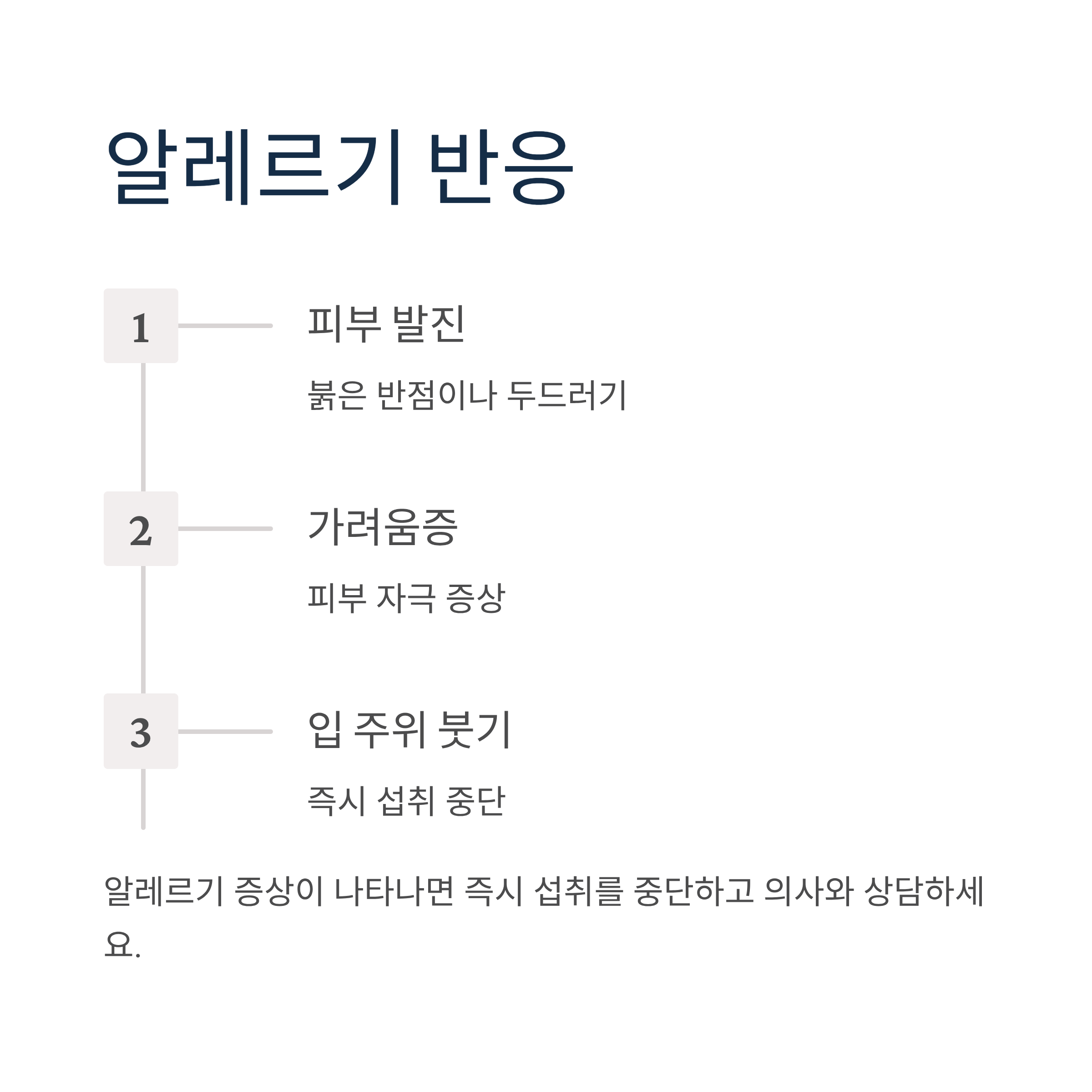 알레르기 반응피부 발진, 가려움, 입 주위 붓기 등의 알레르기 증상이 나타나면 즉시 섭취를 중단하고 의사와 상담하세요.