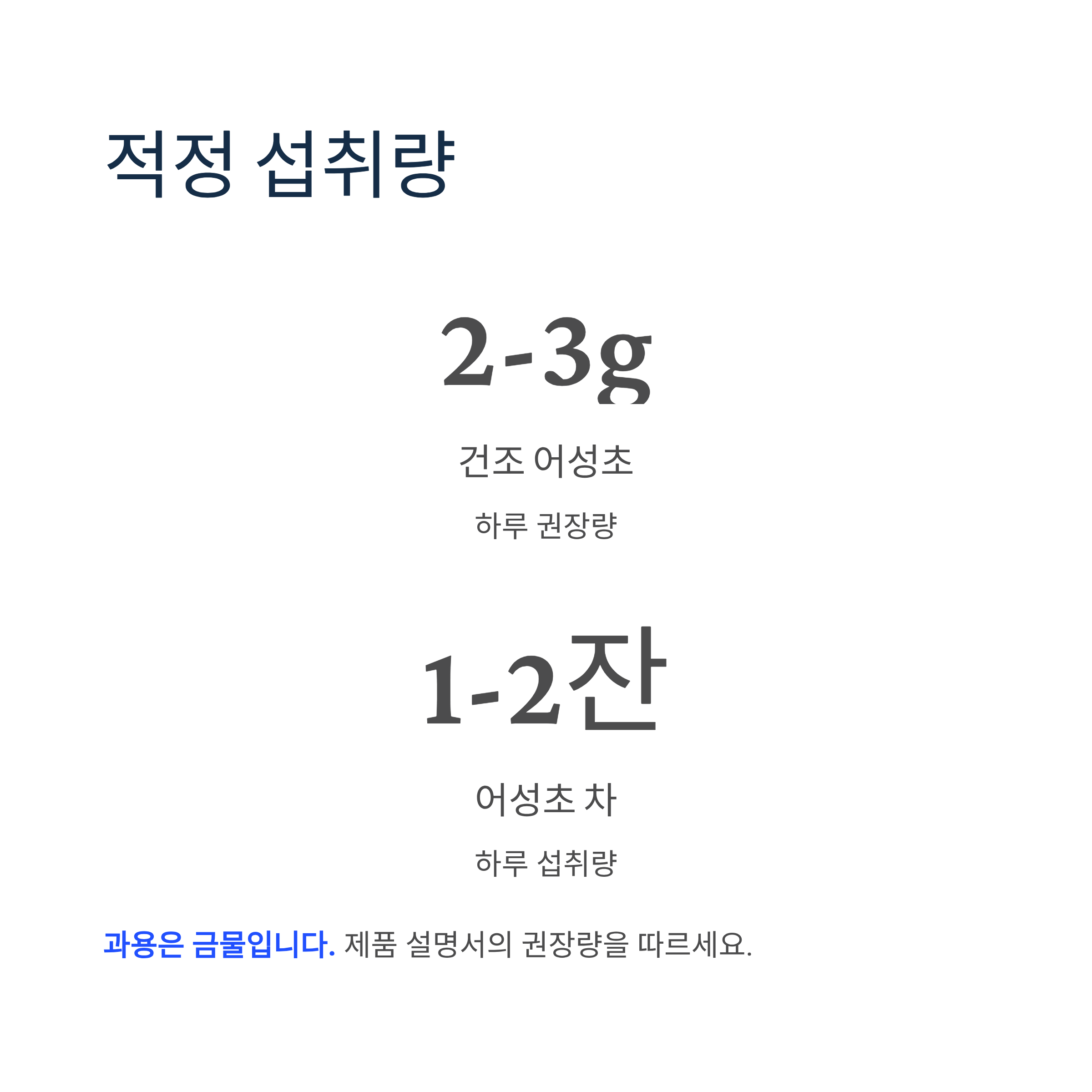 적정 섭취량건조 어성초 기준 하루 2~3g, 차로 우려 마시는 경우 하루 1~2잔이 적당합니다. 과용은 금물입니다.