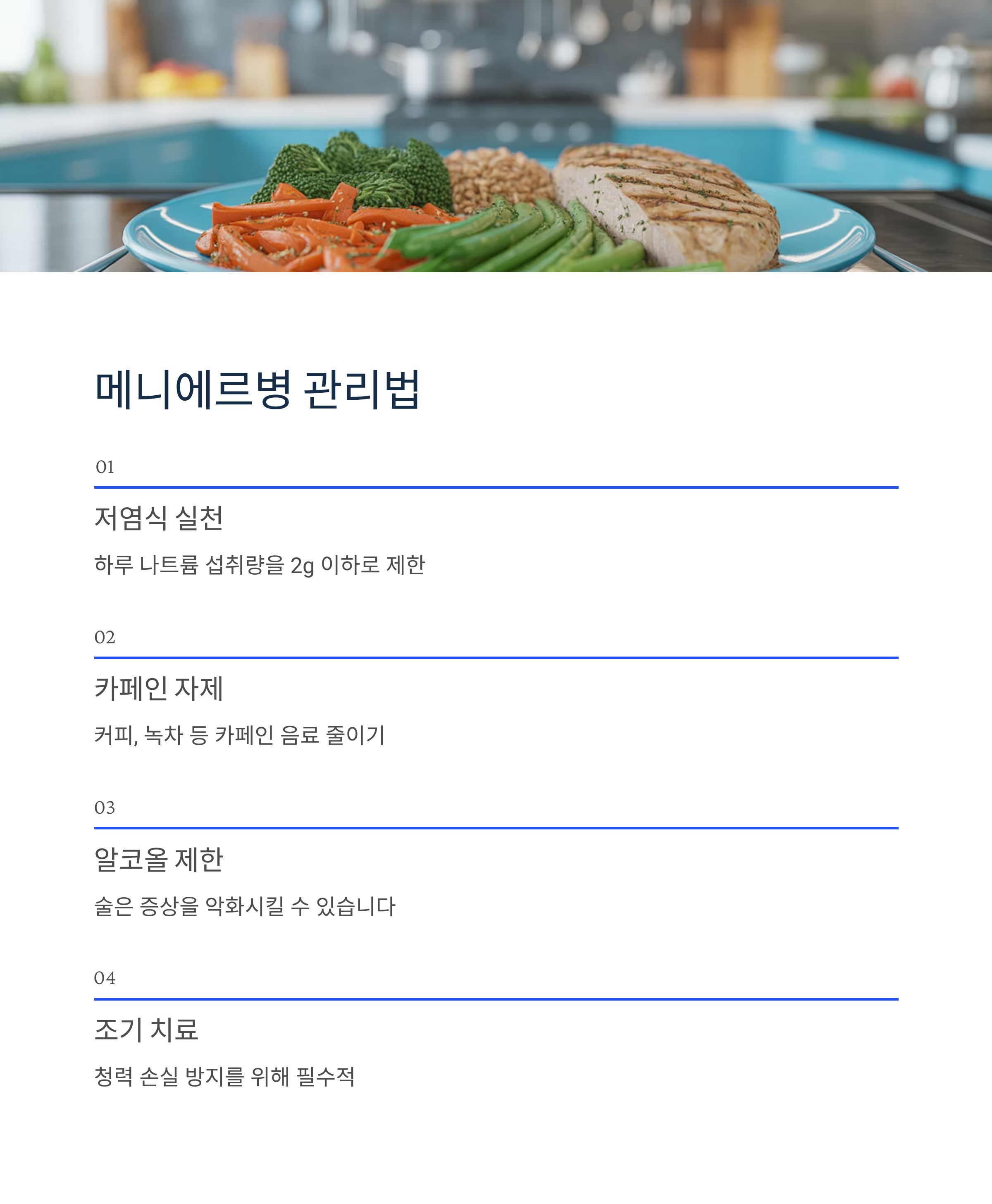 이석증과 달리 어떤 자세를 취해도 어지럼증이 사라지지 않으며, 발작이 반복되면 청력 손실이 누적될 수 있어 조기 치료가 필수적입니다. 저염식과 카페인·알코올 자제 등 생활습관 관리가 매우 중요합니다.