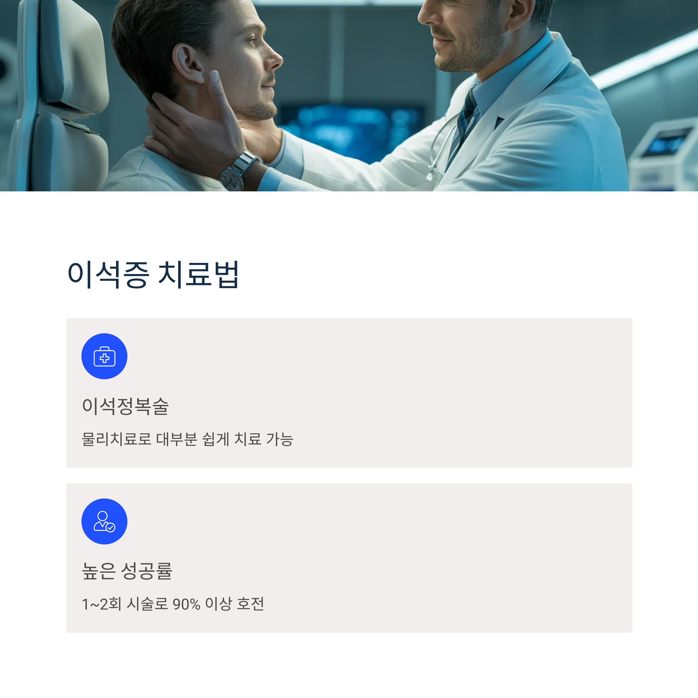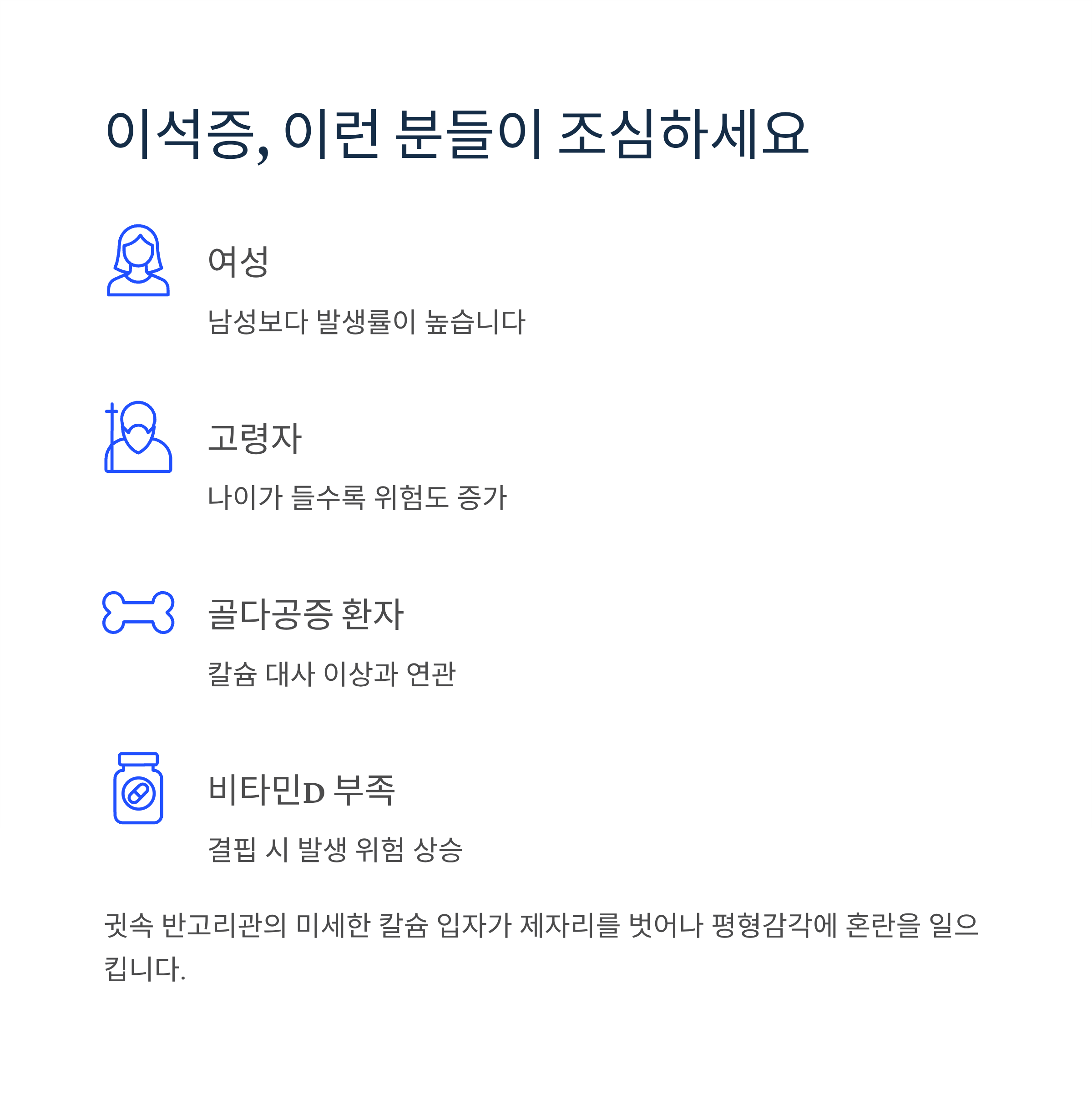 여성, 고령자, 골다공증이나 비타민D 부족 환자에게서 더 흔하게 발생하며, 이석정복술이라는 물리치료로 대부분 쉽게 치료됩니다.