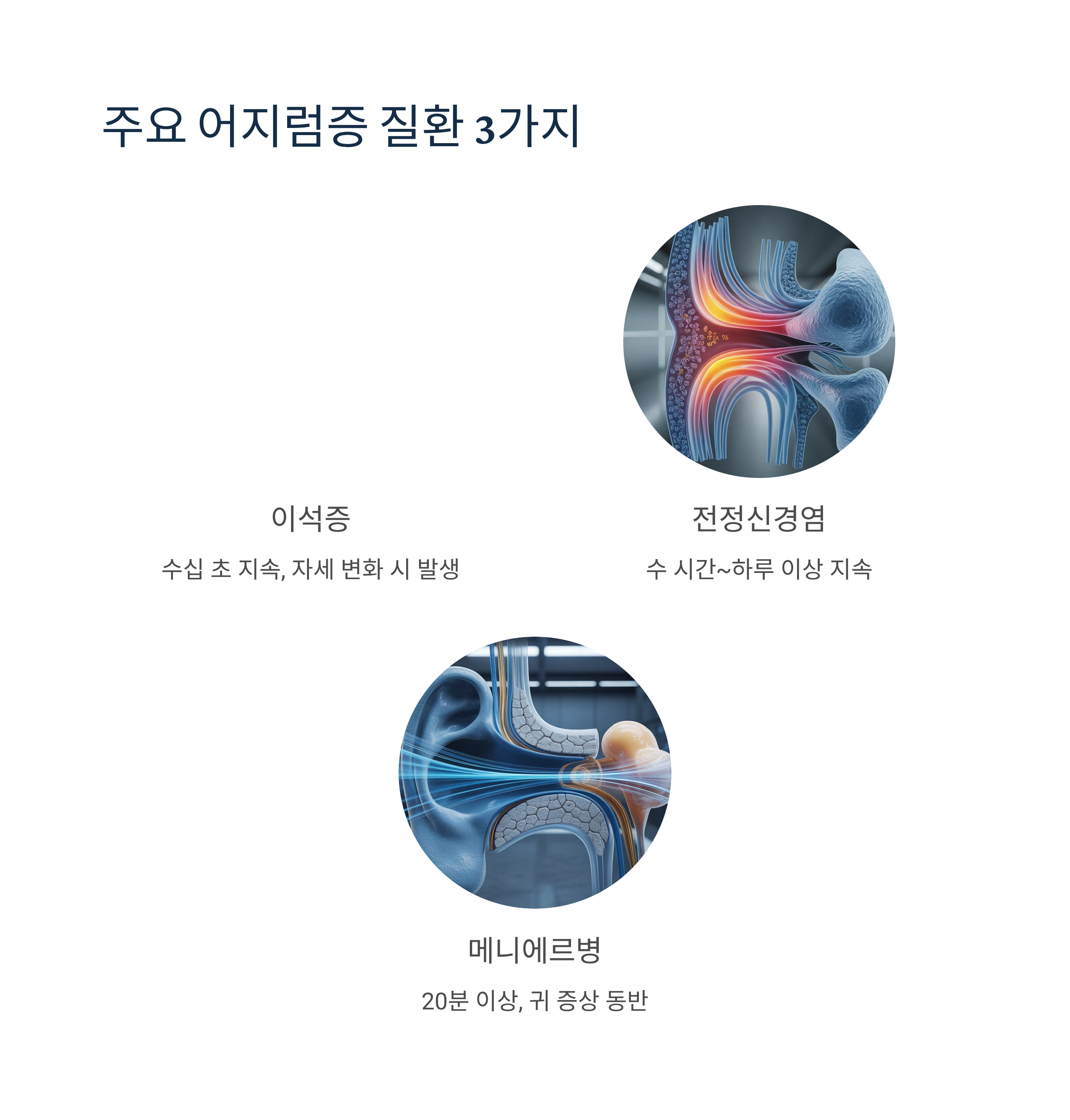 어지럼증 질환마다 지속 시간이 확연히 다릅니다. 이석증은 수십 초, 메니에르병은 수십 분에서 수 시간, 전정신경염은 몇 시간에서 하루 이상 지속되는 특징이 있습니다. 이 간단한 구별법만 알아도 병원 방문 시 정확한 진단에 큰 도움이 됩니다.