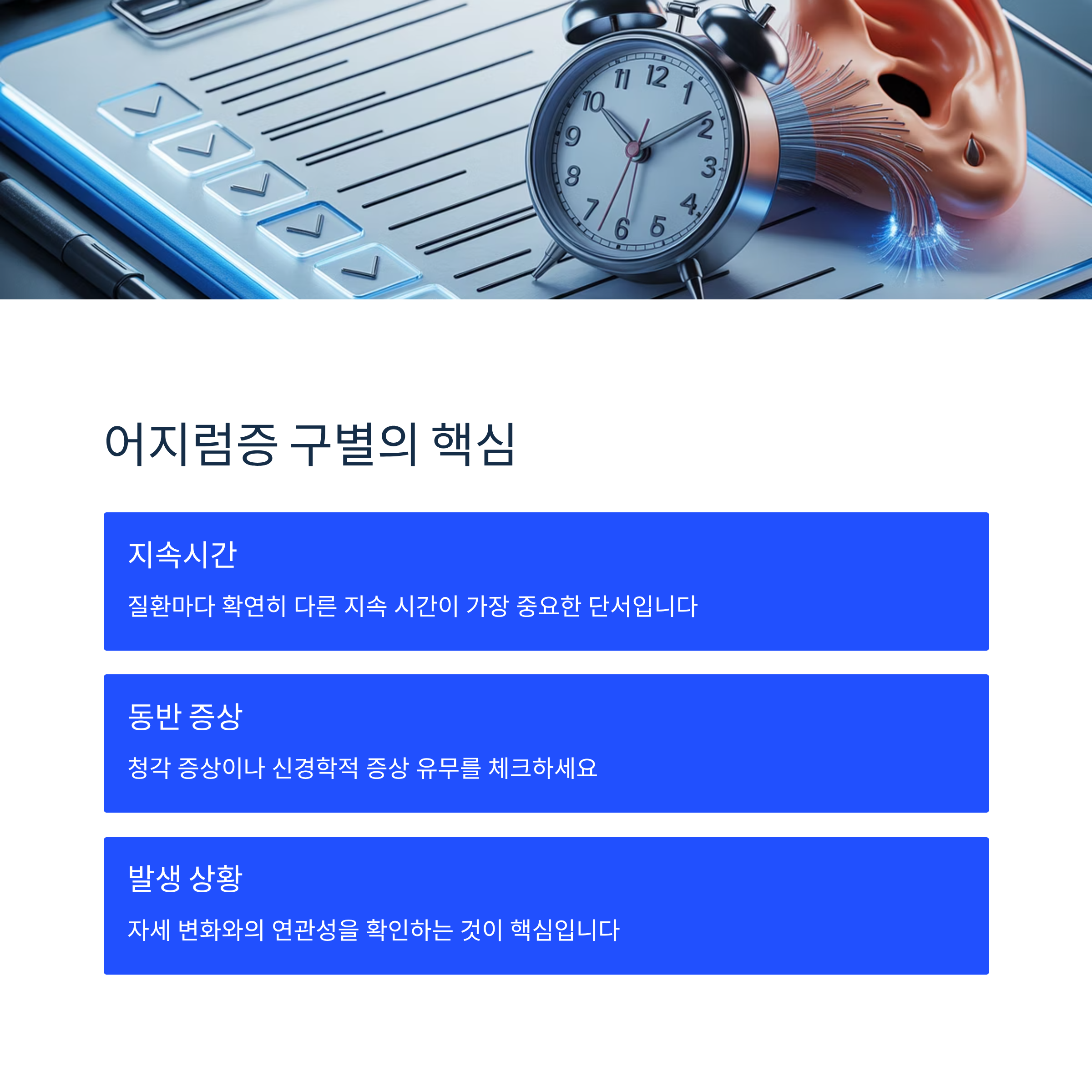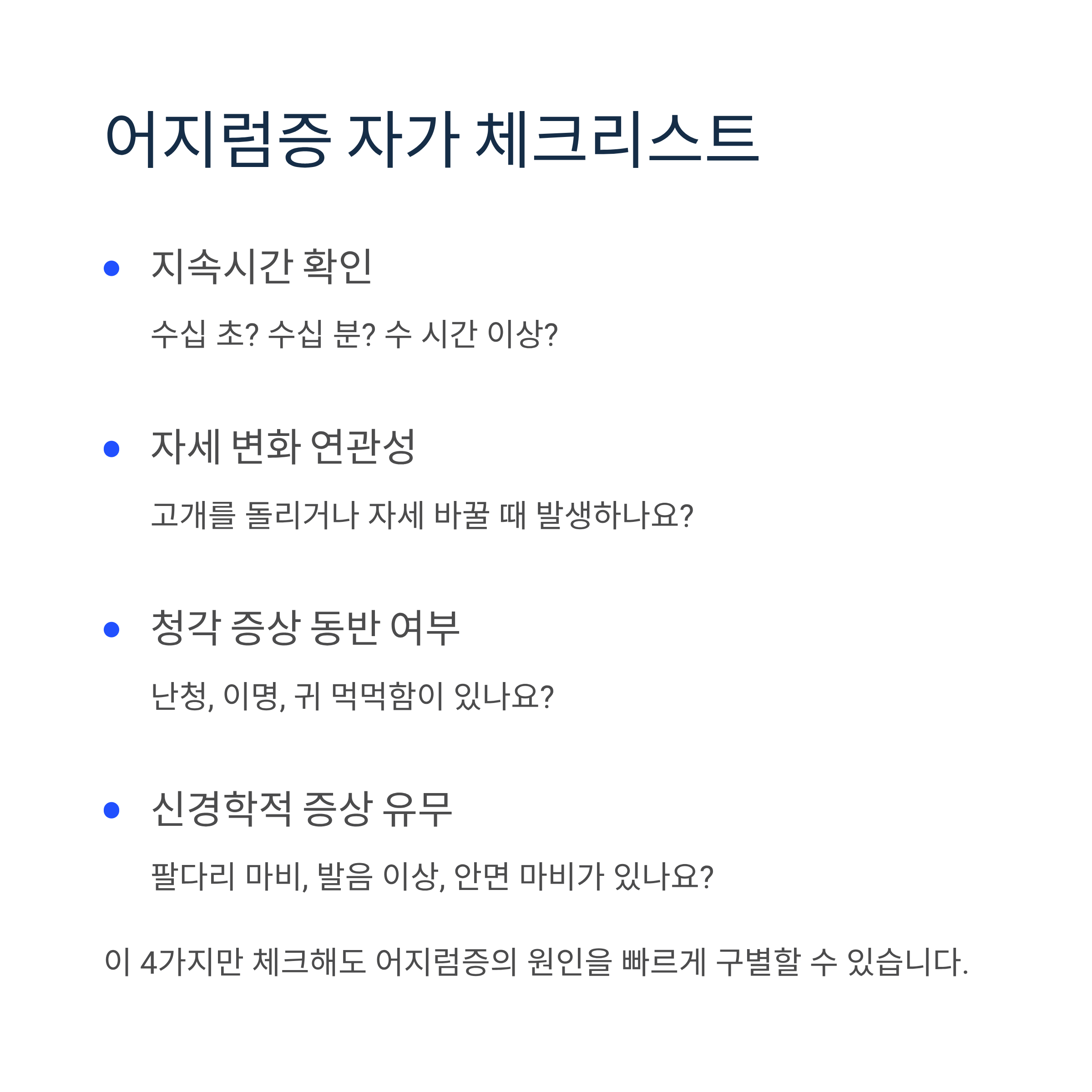 단순히 '빈혈'로 넘기지 말고 지속시간, 자세 변화 연관성, 청각 증상 동반 여부, 신경학적 증상 유무를 체크한다면 어지럼증의 원인을 빠르게 구별할 수 있습니다.