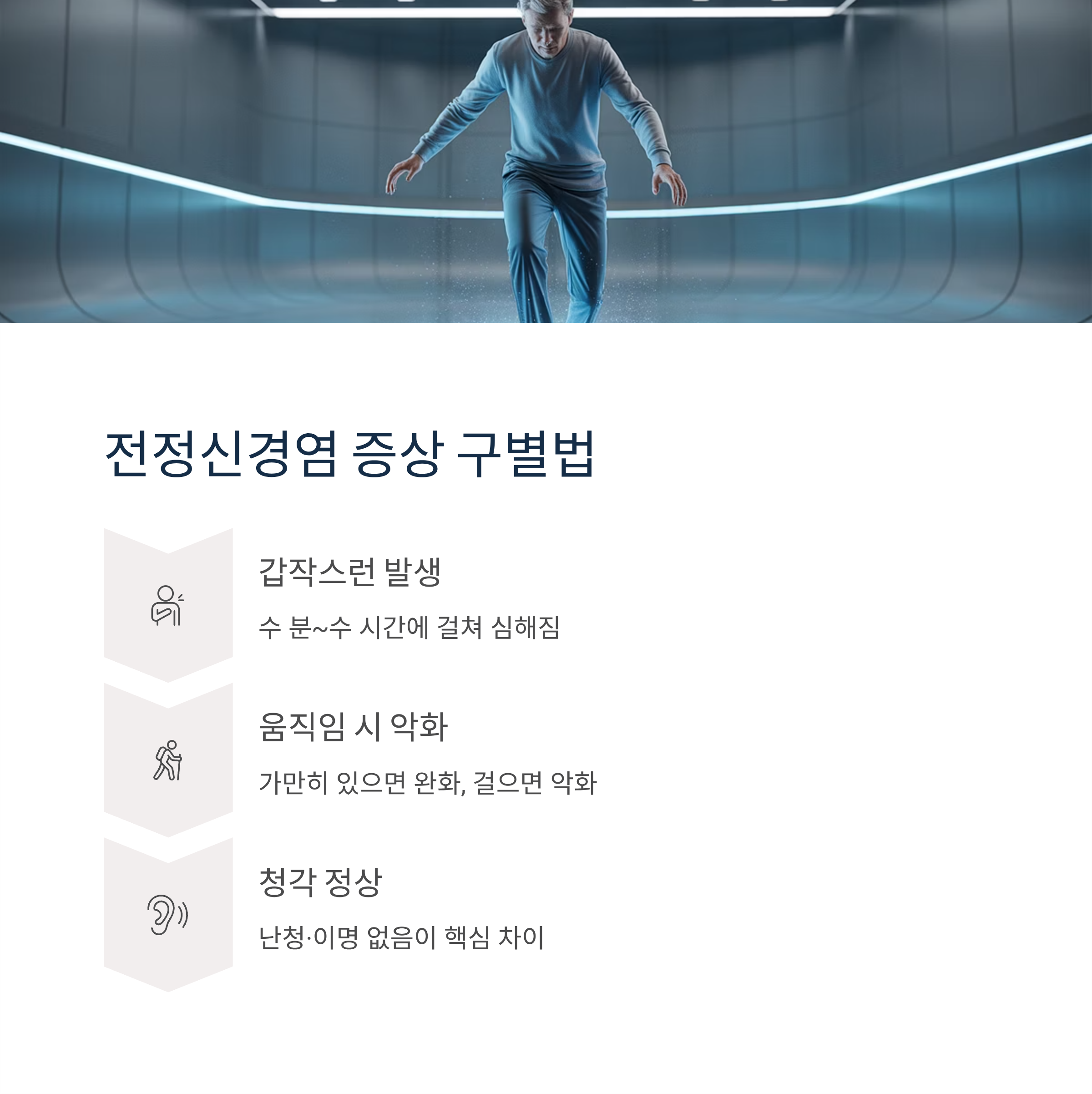 전정신경염은 갑자기 발생해 수 분, 수 시간에 걸쳐 심해지고, 가만히 있을 때는 증상이 완화됐다가 걸을 때 더욱 악화되는 특징이 있습니다. 청각과 관련된 증상을 동반하지 않는 것이 메니에르병과 다른 결정적 차이입니다.