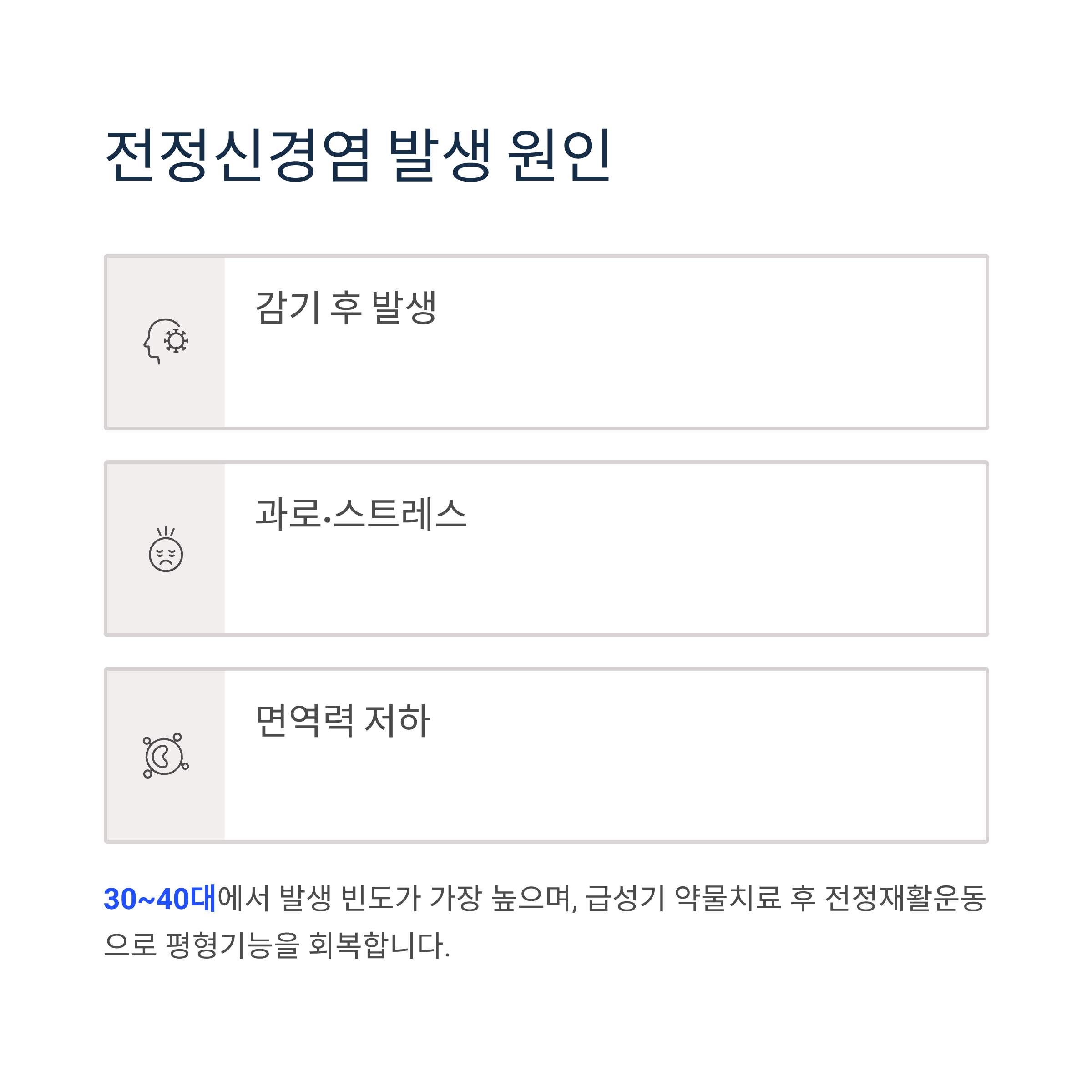 감기를 앓은 후나 과로, 스트레스로 면역력이 떨어진 상태에서 주로 발생하며, 30~40대에서 빈도가 가장 높습니다. 급성기에는 약물치료를 하고, 이후 전정재활운동을 통해 평형기능 회복을 돕는 것이 핵심입니다.