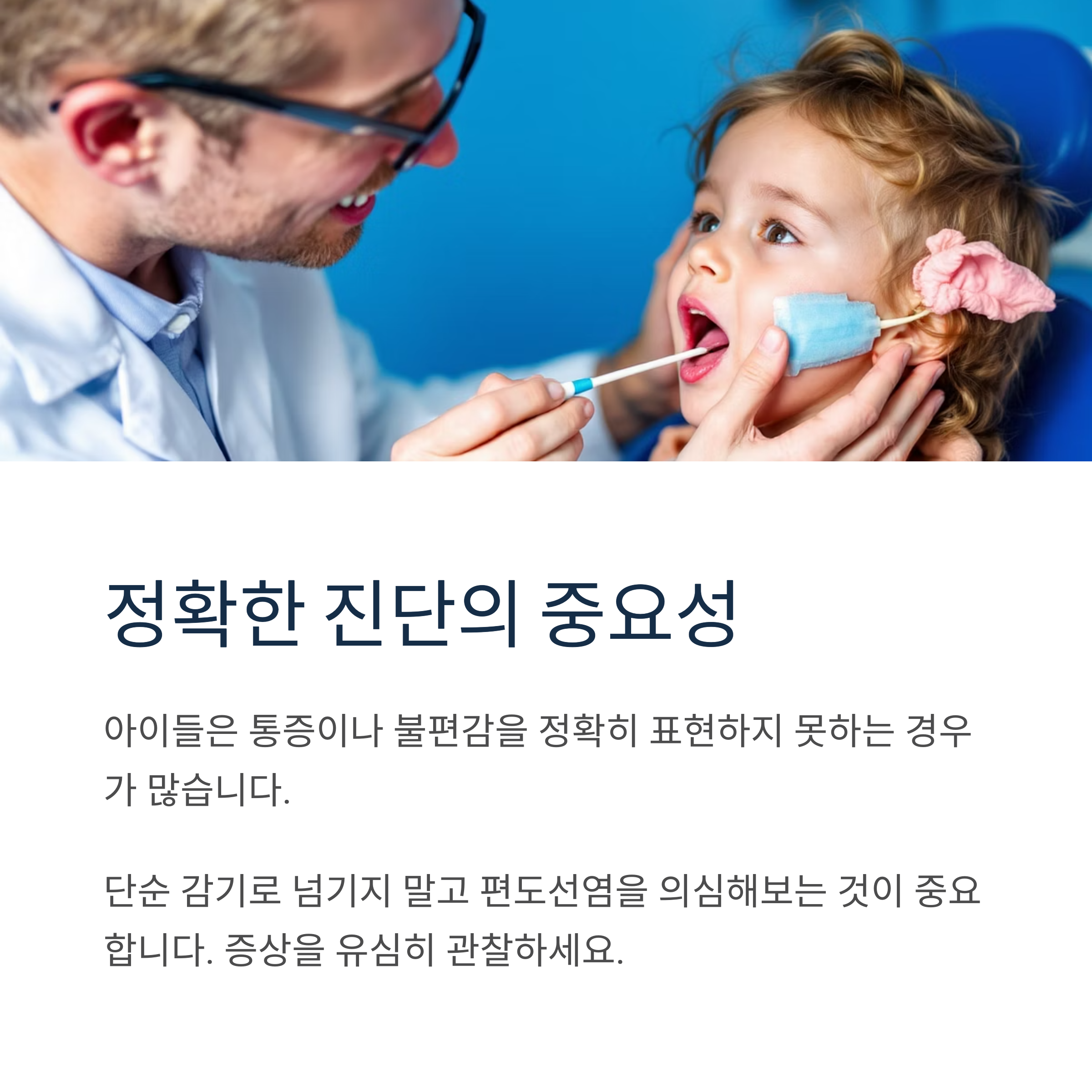 아이들은 통증이나 불편감을 정확히 표현하지 못하는 경우가 많습니다. 부모가 위의 증상들을 유심히 관찰하고, 단순 감기로 넘기지 말고 편도선염을 의심해보는 것이 중요합니다.