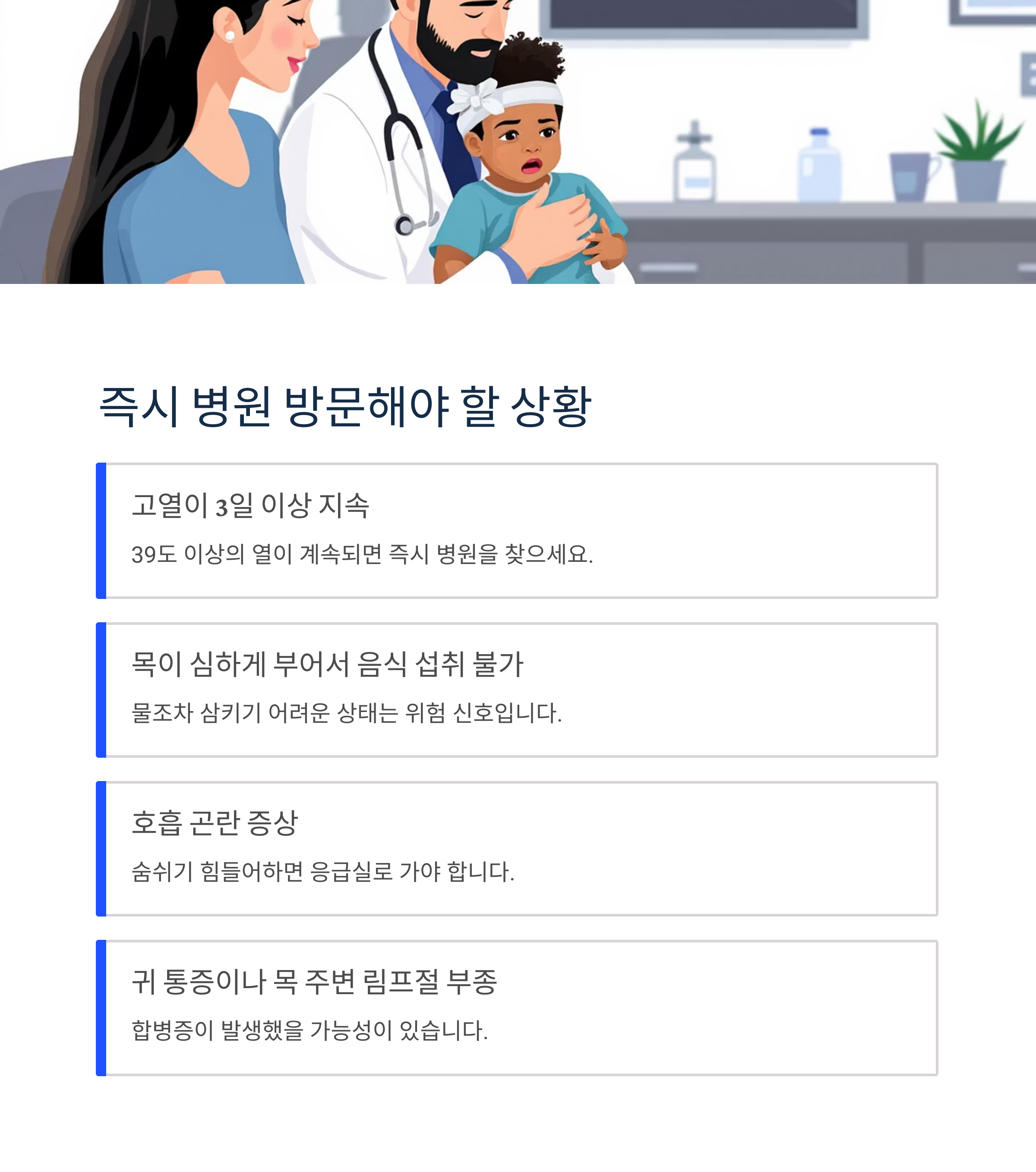 집에서 2-3일 관리해도 호전되지 않거나 다음 증상이 나타나면 즉시 소아과를 방문해야 합니다:
