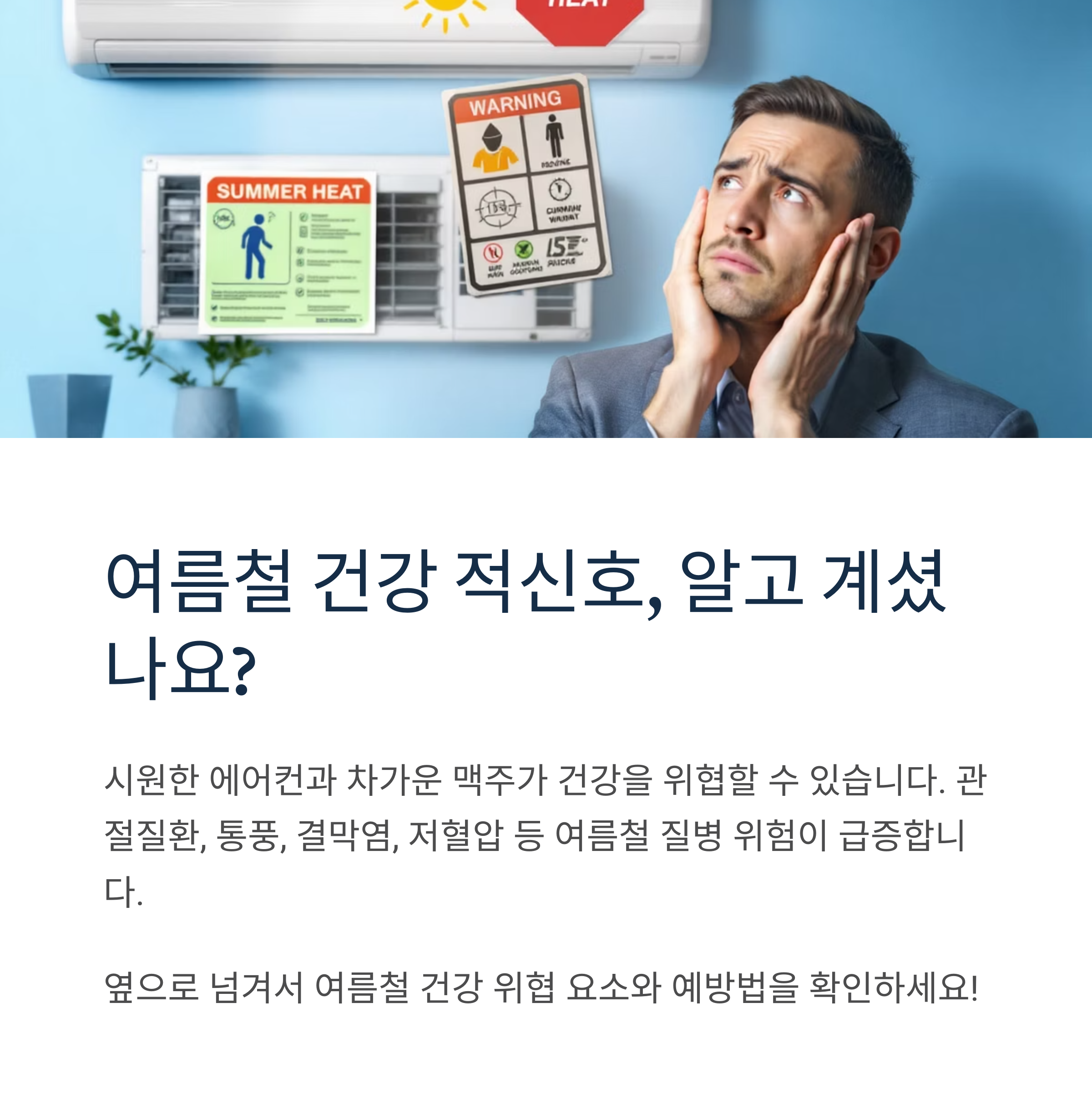 무더운 여름, 시원한 에어컨 바람과 차가운 맥주 한 잔으로 더위를 달래고 싶은 마음은 누구나 같을 것입니다. 하지만 잠깐! 이런 평범한 여름 일상이 뜻하지 않은 건강 적신호를 보낼 수 있다는 사실을 알고 계신가요?