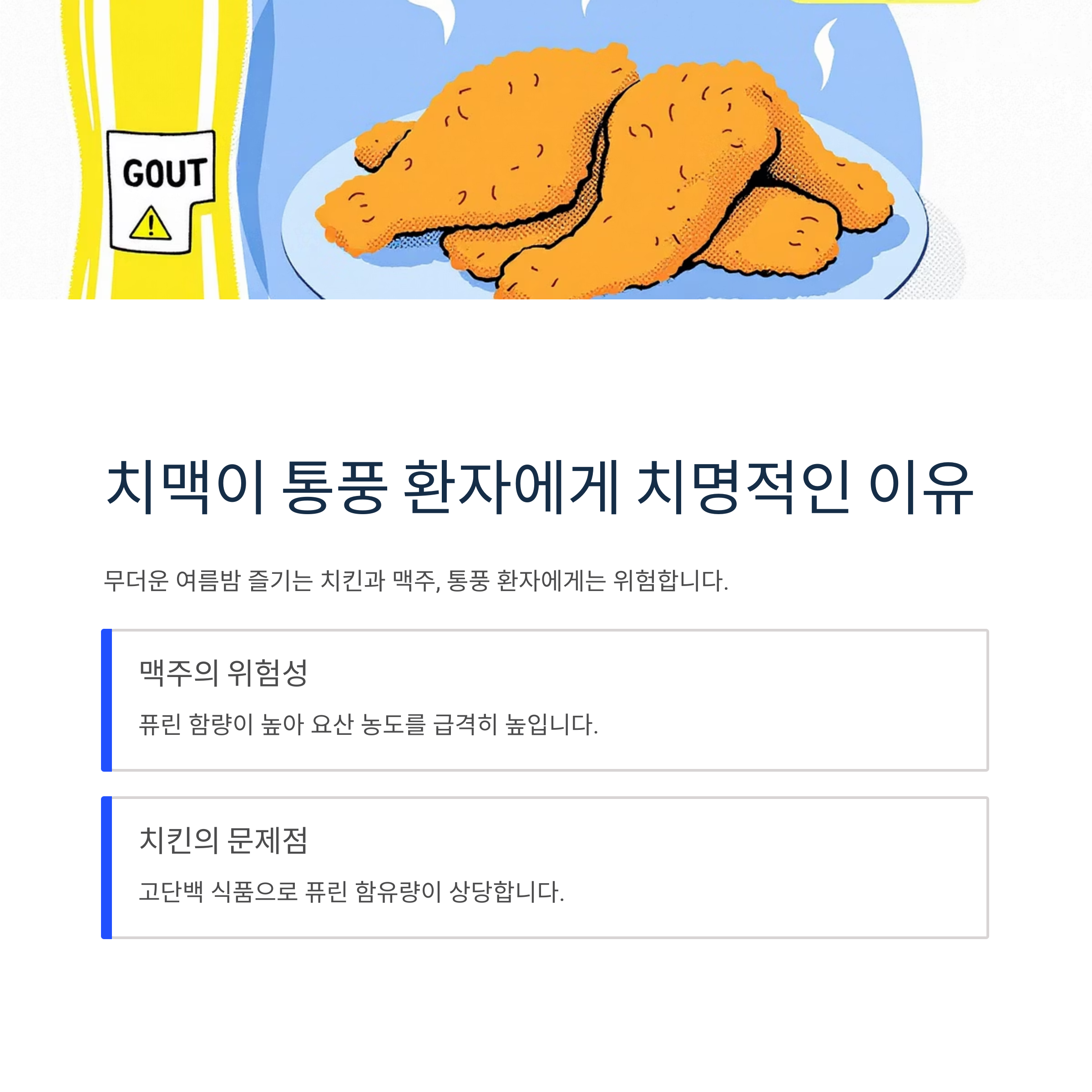 무더운 여름밤, 시원한 맥주와 바삭한 치킨의 조합은 많은 사람들이 즐기는 대표적인 여름 메뉴입니다. 하지만 통풍 환자에게는 치명적인 조합이 될 수 있습니다.