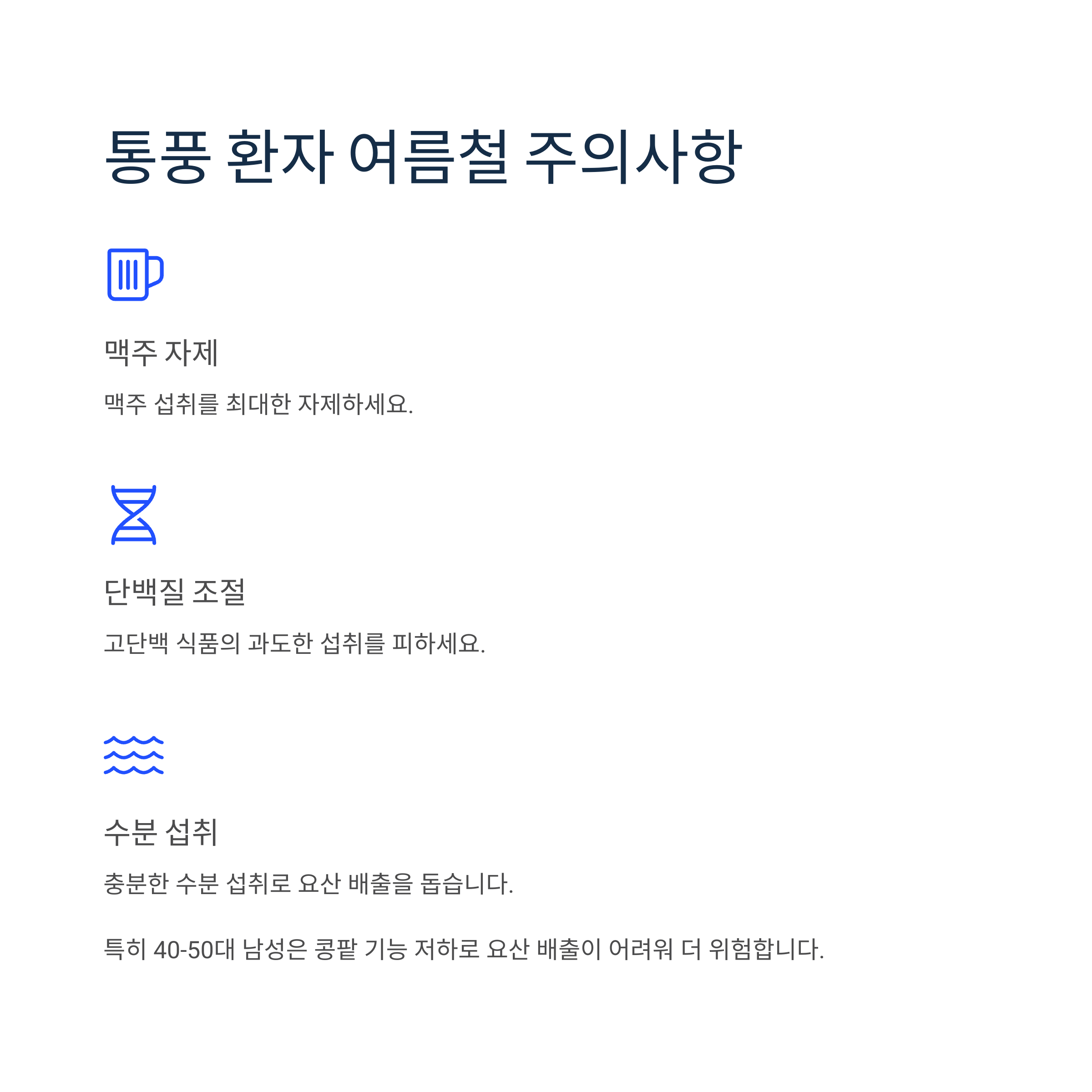 - 충분한 수분 섭취로 요산 배출 돕기