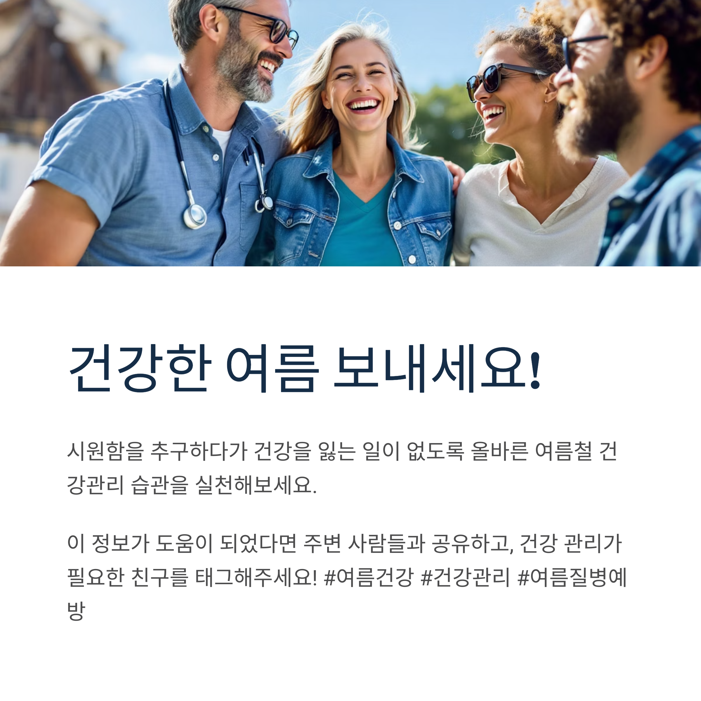 무더운 여름, 시원함을 추구하다가 건강을 잃는 일이 없도록 이제부터라도 올바른 여름철 건강관리 습관을 실천해보세요. 작은 관심과 주의만으로도 건강하고 즐거운 여름을 보낼 수 있습니다.