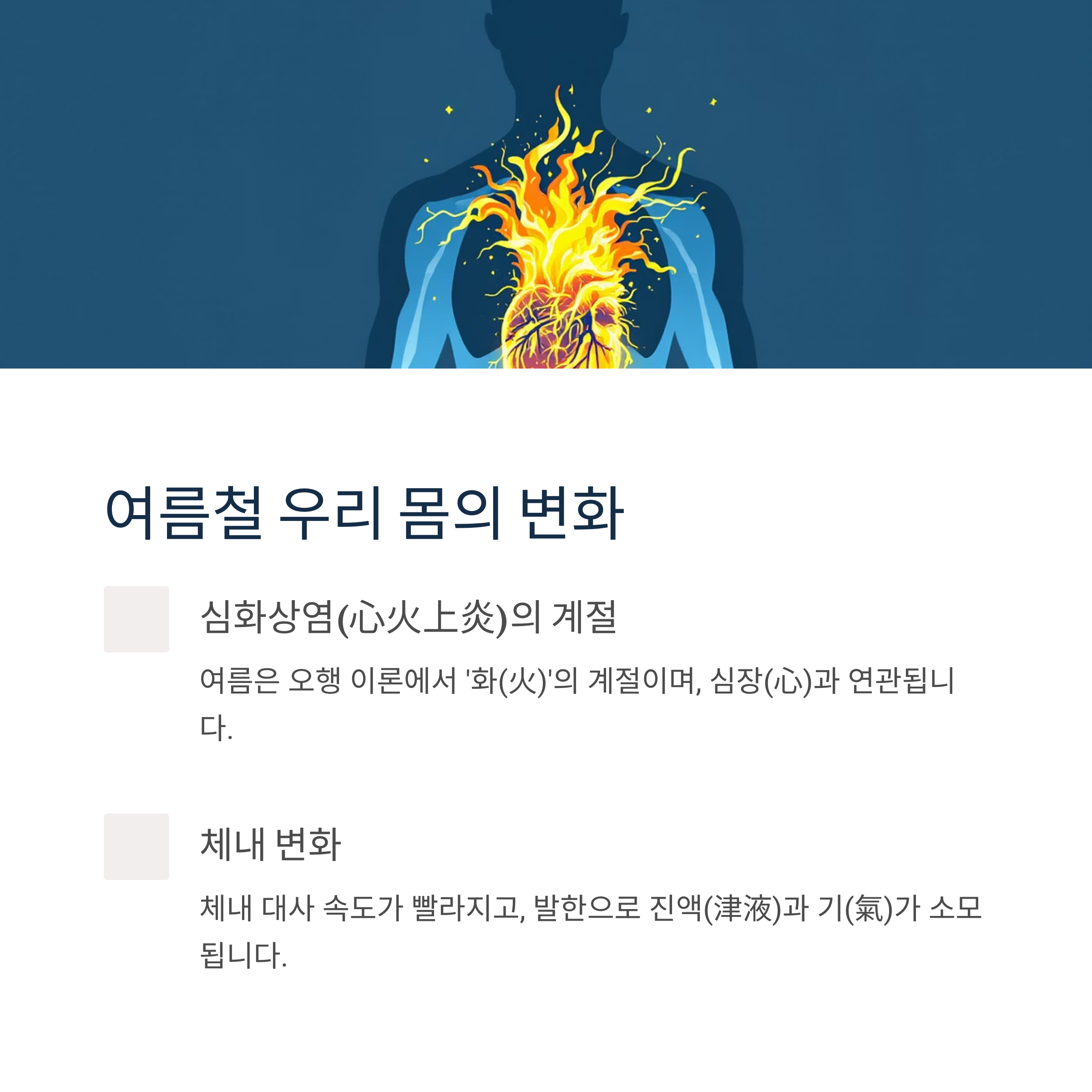 7월부터 본격화되는 무더위는 단순히 덥다는 것 이상의 의미를 갖습니다. 한의학에서는 이 시기를 '심화상염(心火上炎)'의 계절로 분류합니다.