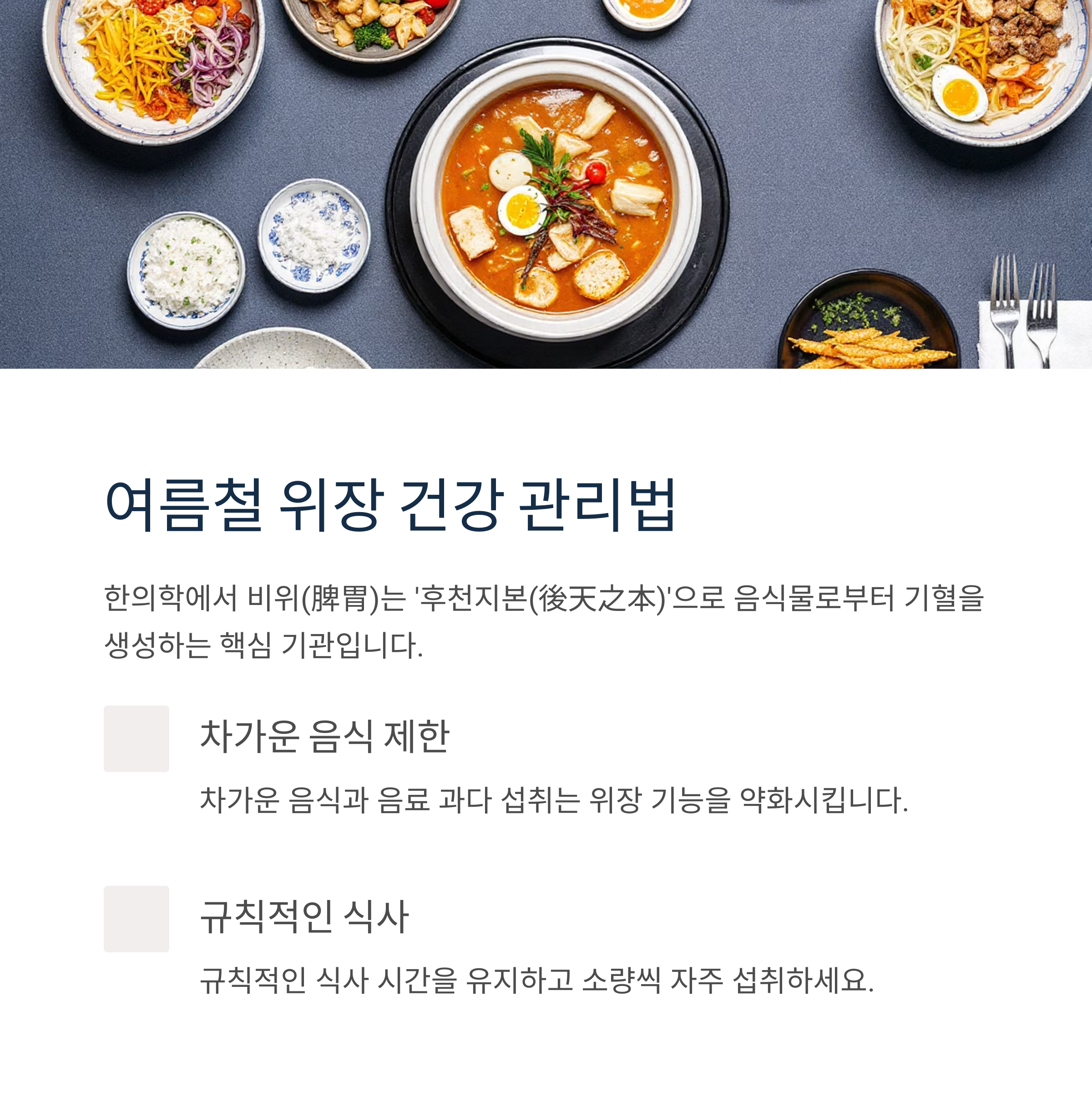 여름철에는 위장 기능도 쉽게 저하됩니다. 한의학에서 비위(脾胃)는 '후천지본(後天之本)'으로 불리며, 음식물로부터 기혈을 생성하는 핵심 기관입니다.