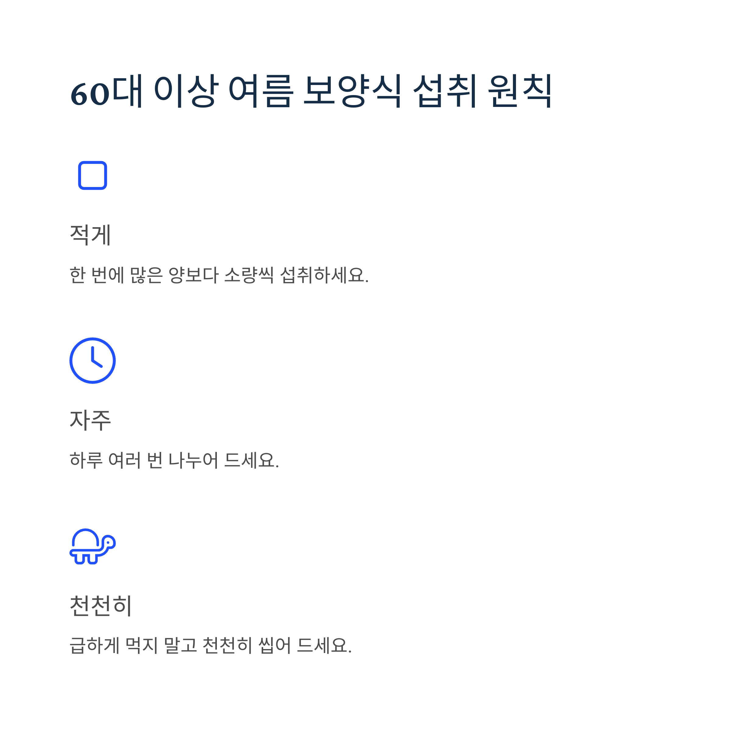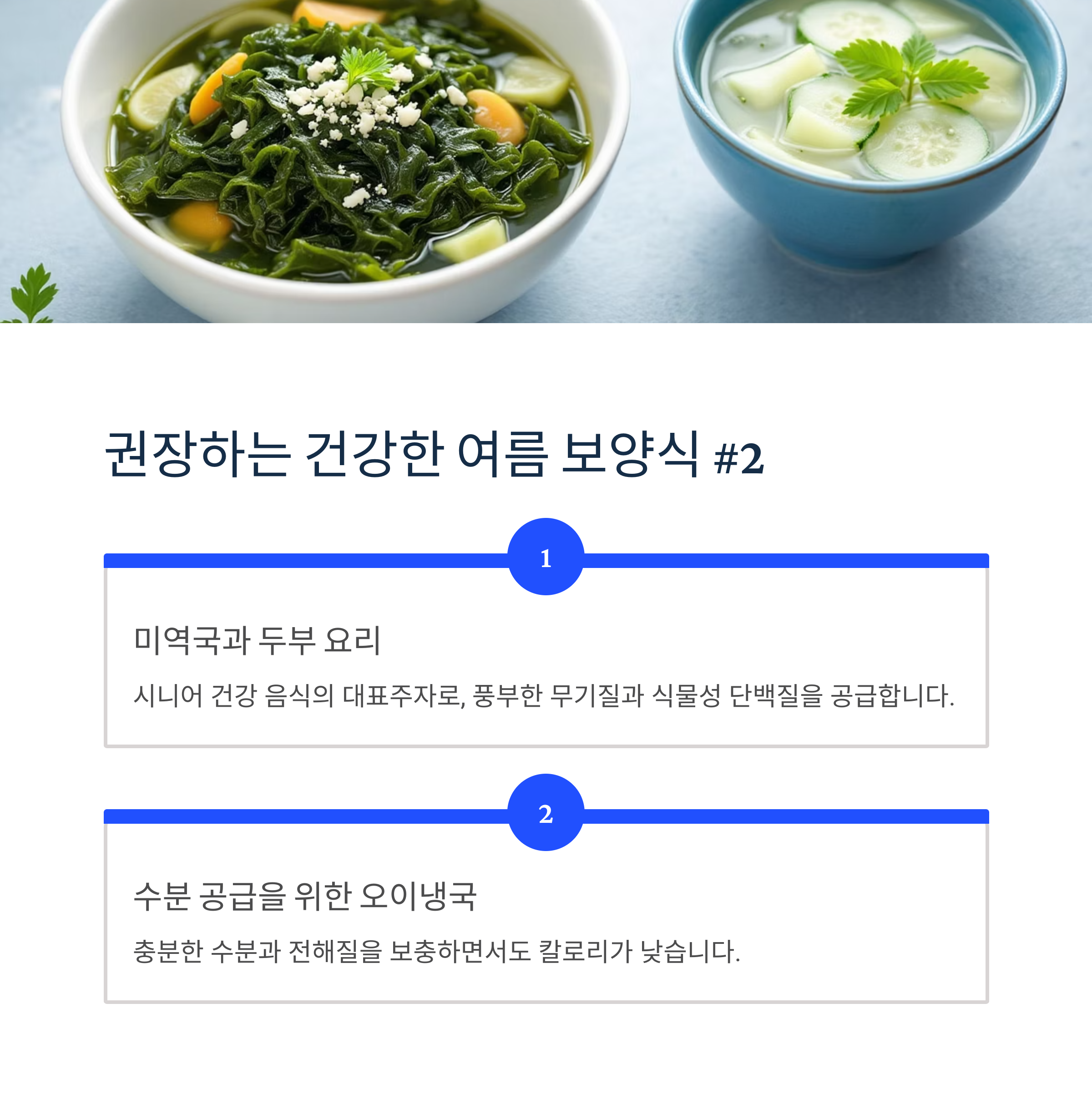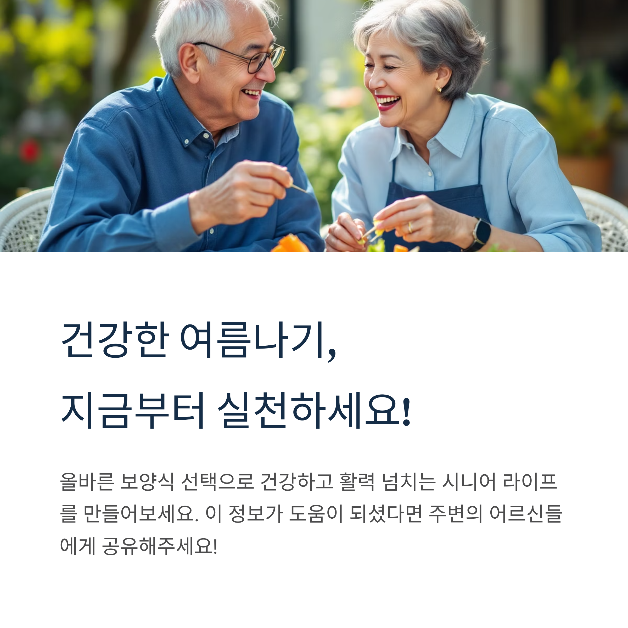 올 여름, 올바른 보양식 선택으로 건강하고 활력 넘치는 시니어 라이프를 만들어보세요. 의문사항이 있으시면 언제든 전문의와 상담하시기 바랍니다.