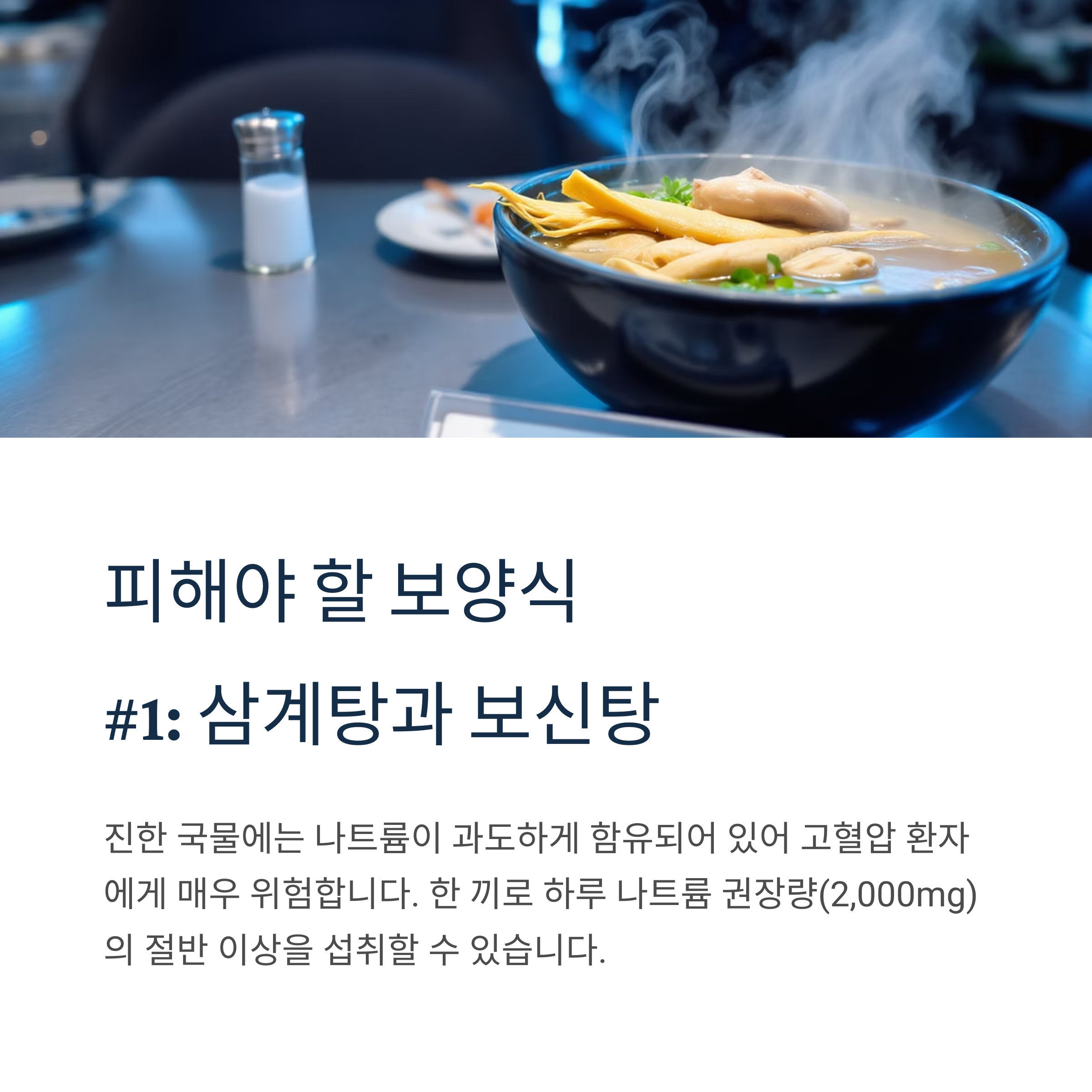 고령자 여름 식단에서 가장 주의해야 할 음식입니다. 삼계탕의 진한 국물에는 나트륨이 과도하게 함유되어 있어 고혈압 환자에게는 매우 위험합니다. 하루 나트륨 권장량(2,000mg)의 절반 이상을 한 끼로 섭취하게 될 수 있습니다.