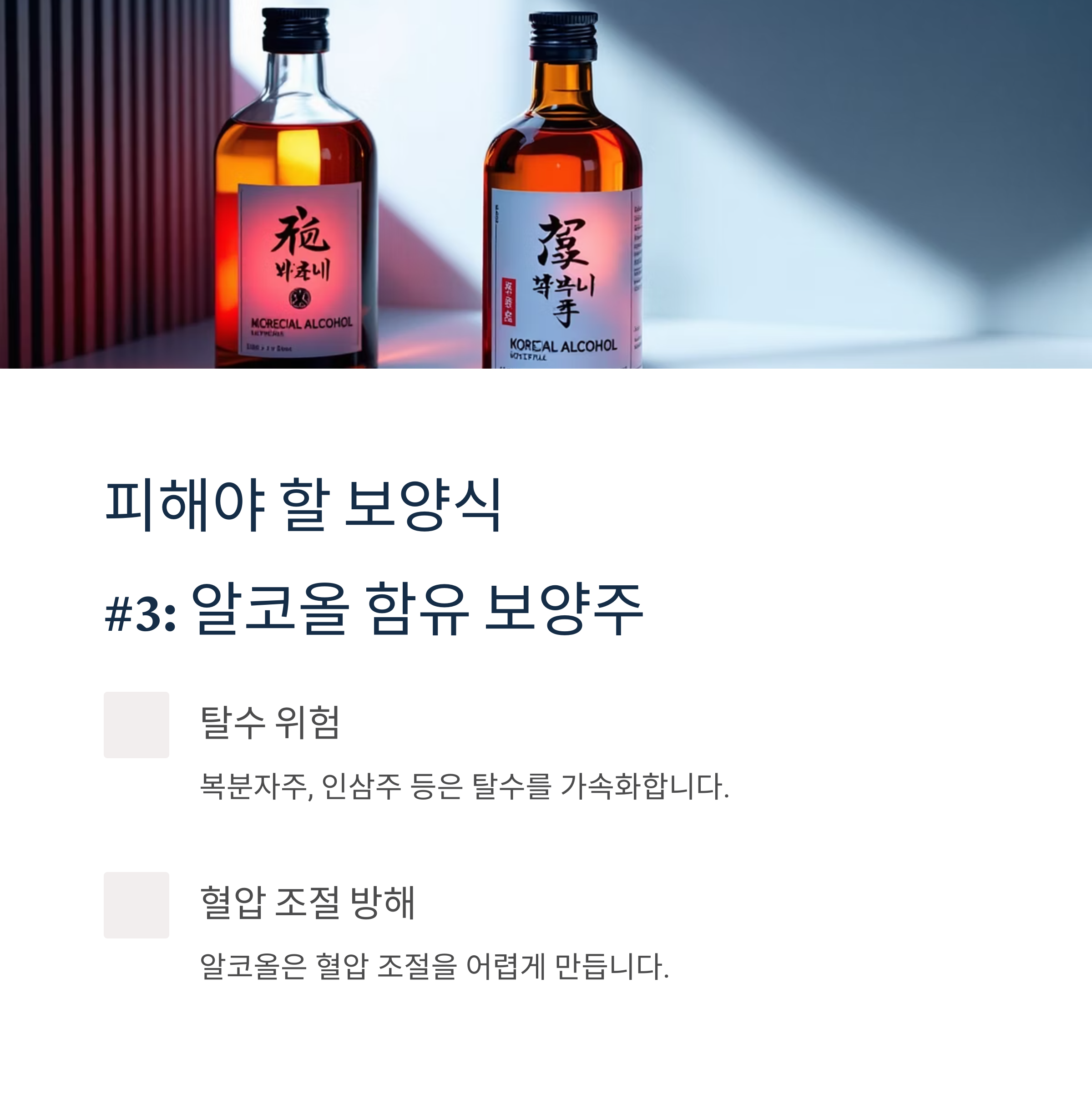 노인 여름 음식 주의사항 중 가장 중요한 것이 바로 알코올입니다. 복분자주, 인삼주 등의 보양주는 탈수를 가속화하고 혈압 조절을 어렵게 만듭니다.