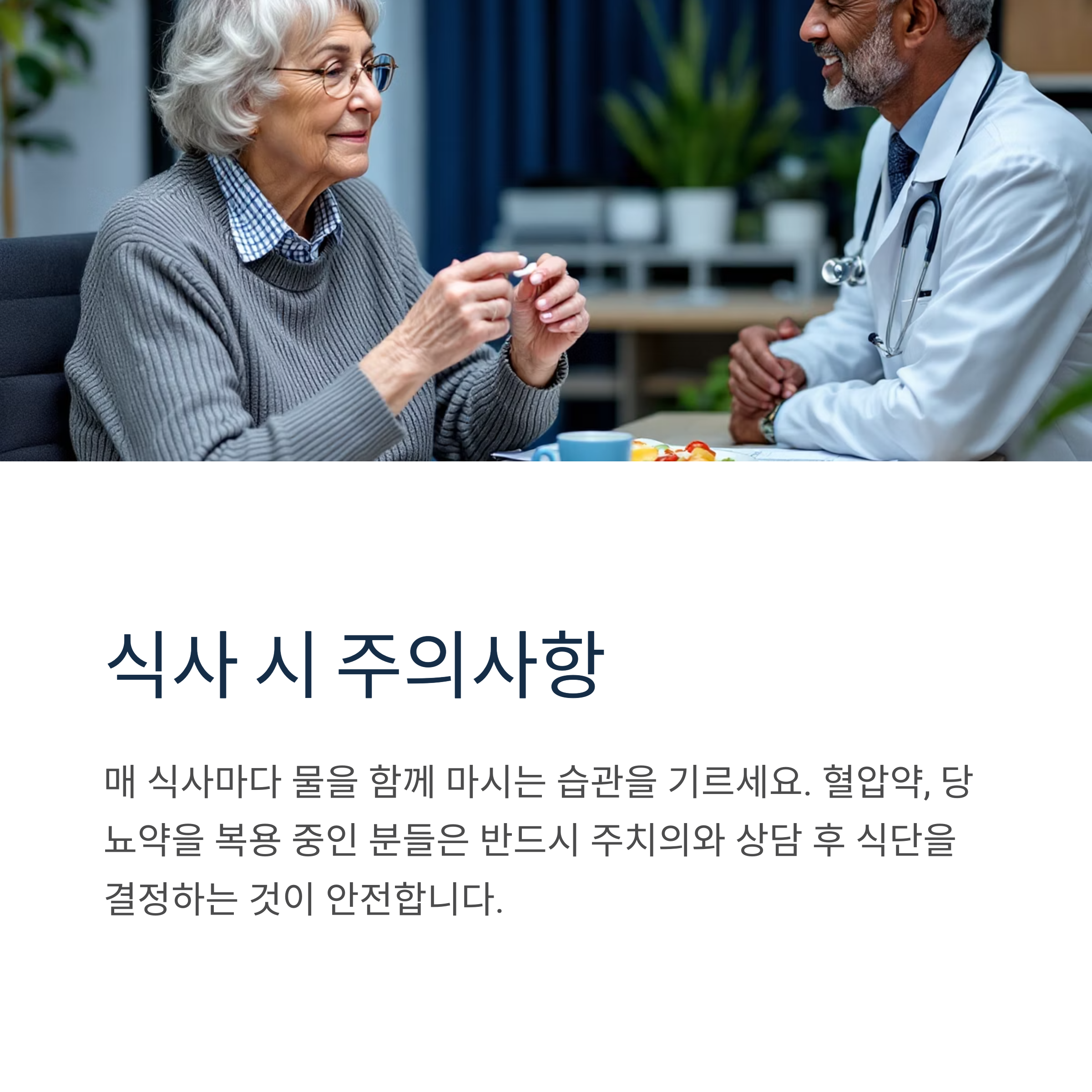 고령자 여름 식단을 계획할 때는 반드시 기존에 앓고 있는 질병과 복용 중인 약물을 고려해야 합니다. 특히 혈압약, 당뇨약을 복용 중인 분들은 주치의와 상담 후 식단을 결정하는 것이 안전합니다.