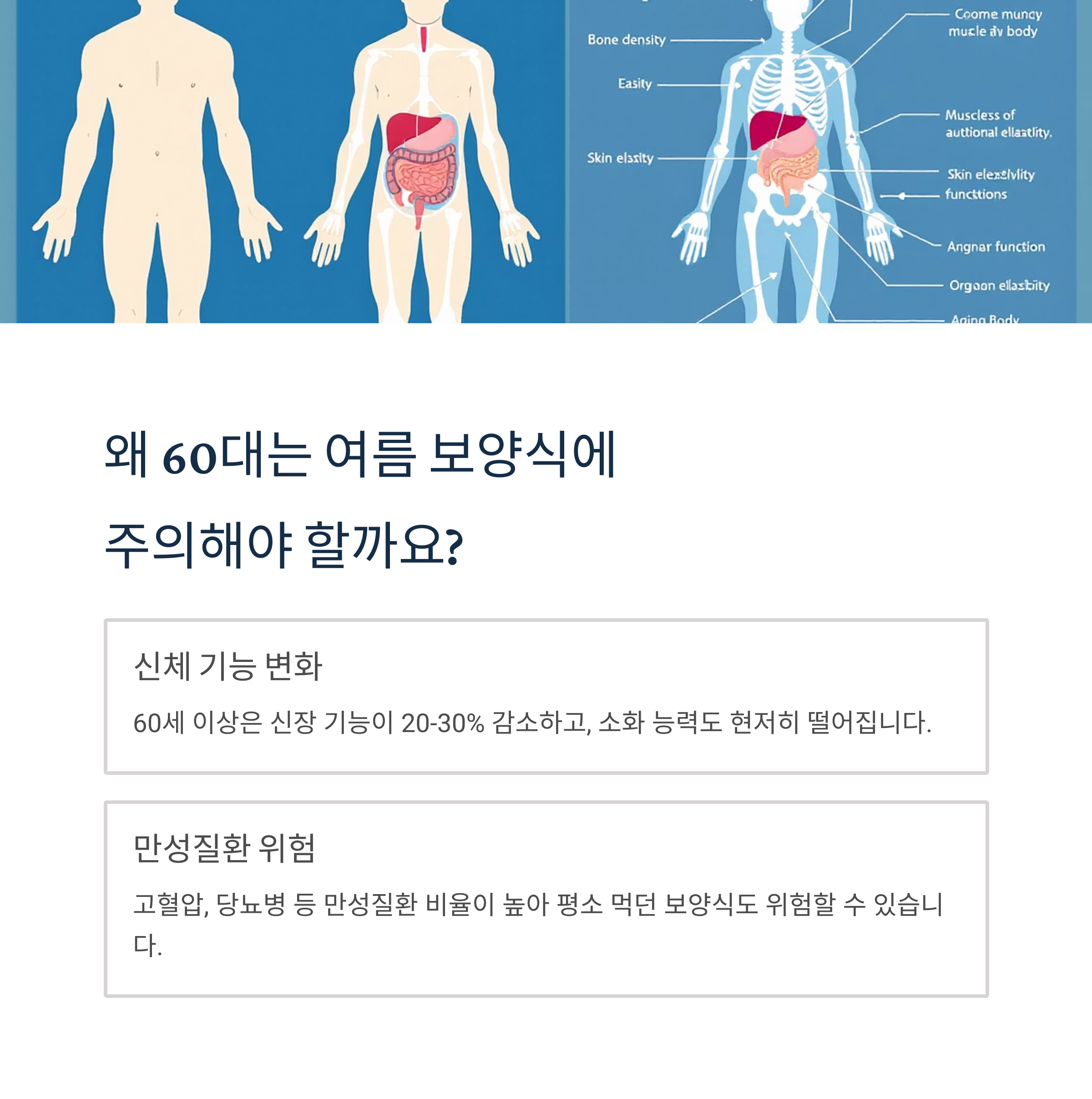 노화로 인한 신체 기능 변화가 가장 큰 이유입니다. 60세 이상이 되면 신장 기능이 20-30% 감소하고, 소화 능력도 현저히 떨어집니다. 또한 고혈압, 당뇨병 등 만성질환을 앓고 있는 비율이 높아 평소 먹던 보양식도 위험할 수 있습니다.