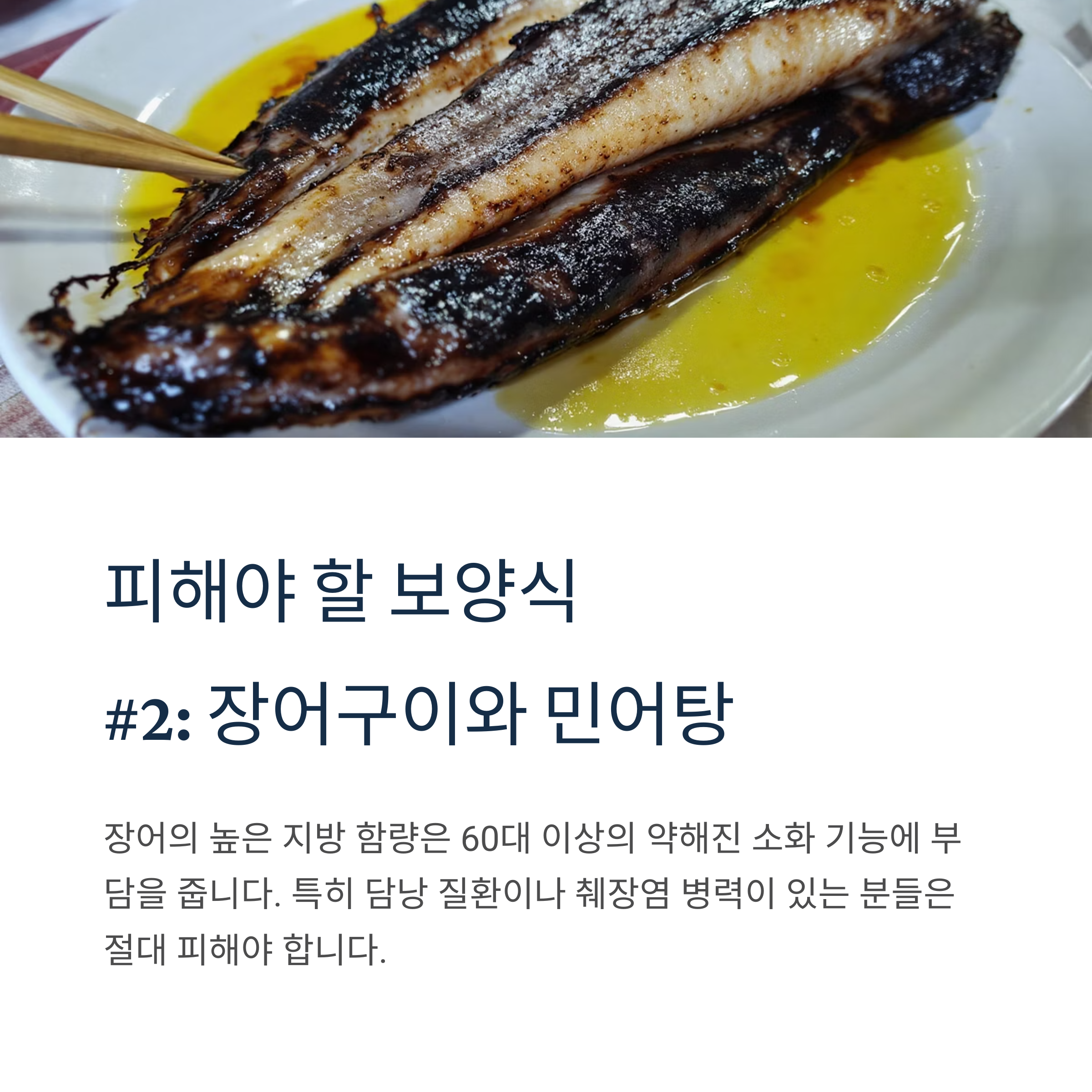장어의 높은 지방 함량은 60대 이상의 약해진 소화 기능에 부담을 줍니다. 특히 담낭 질환이나 췌장염 병력이 있는 분들은 절대 피해야 합니다.