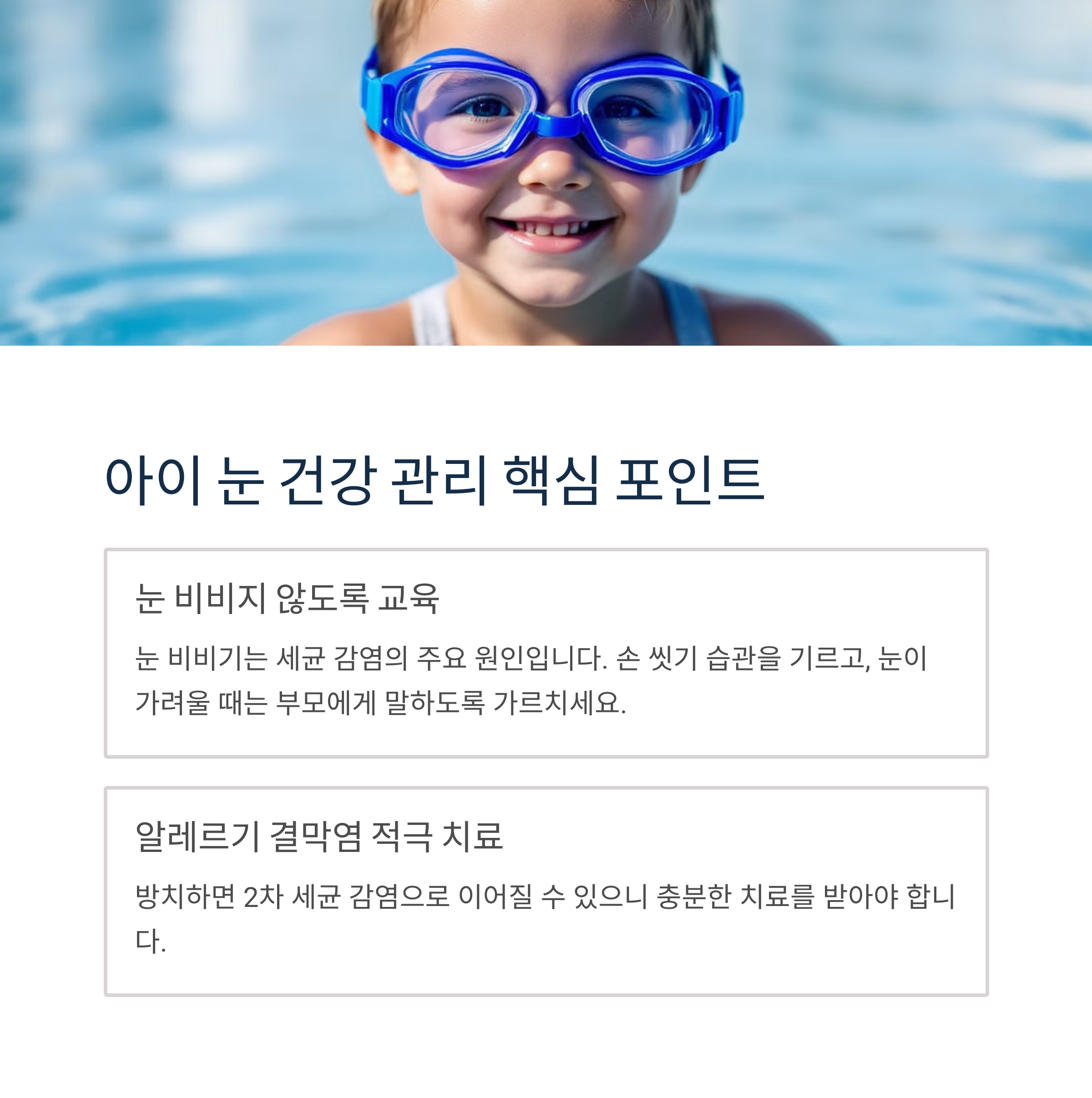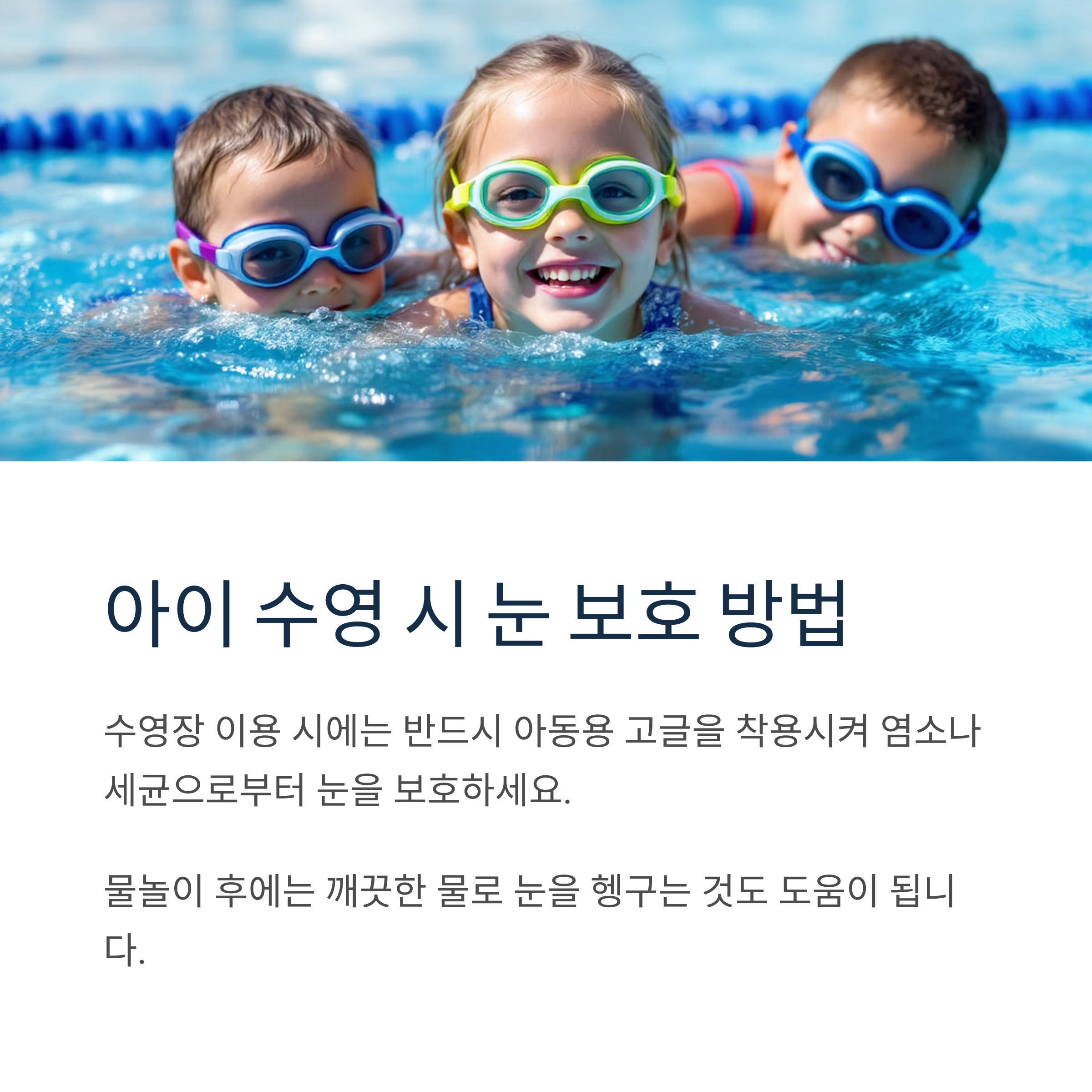 수영장 이용 시에는 반드시 아동용 고글을 착용시켜 염소나 세균으로부터 눈을 보호해야 합니다. 물놀이 후에는 깨끗한 물로 눈을 헹구는 것도 도움이 됩니다.