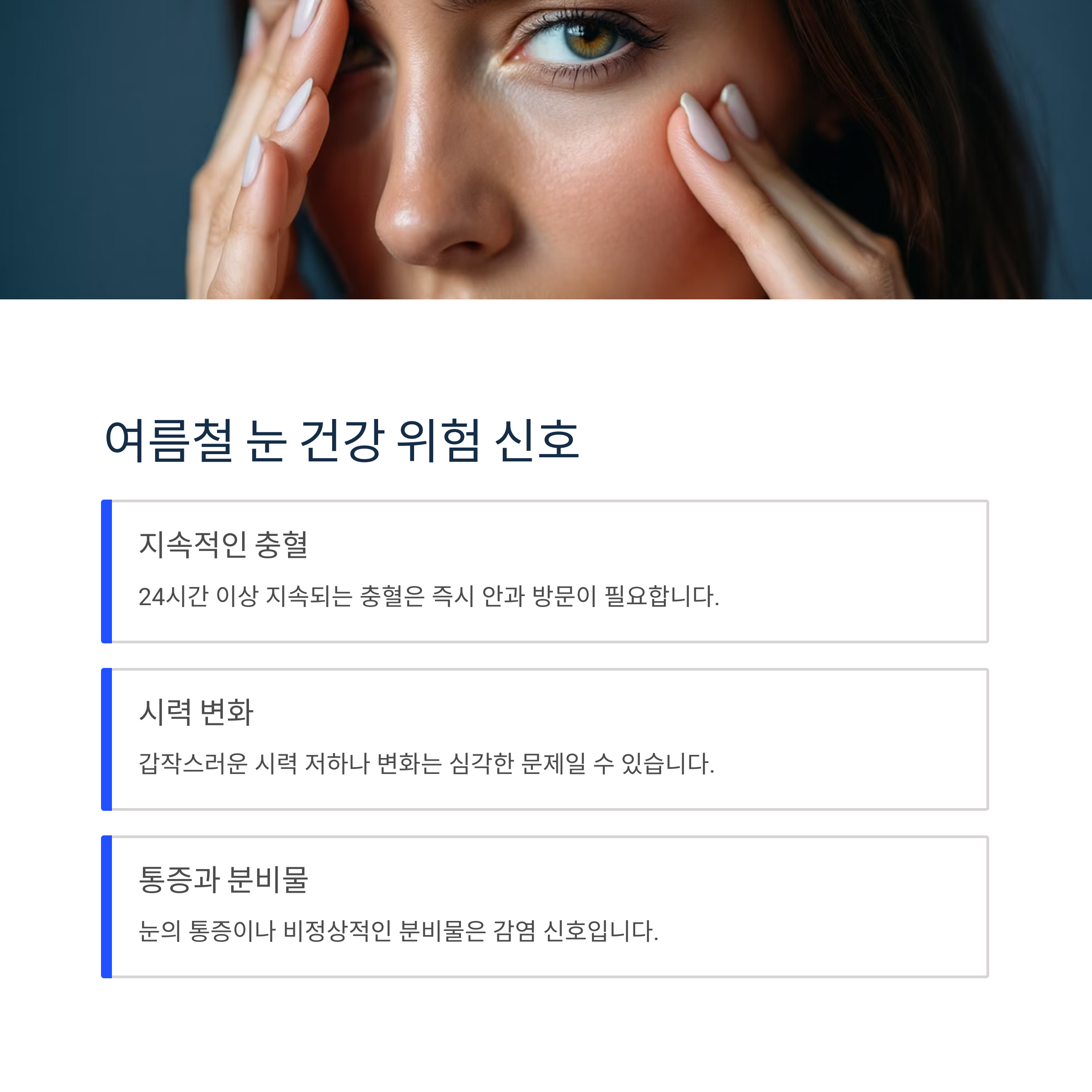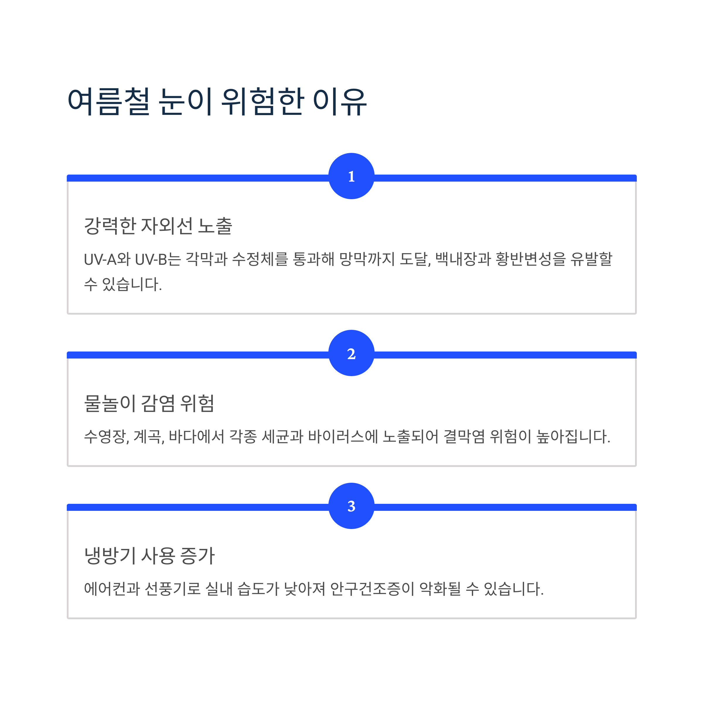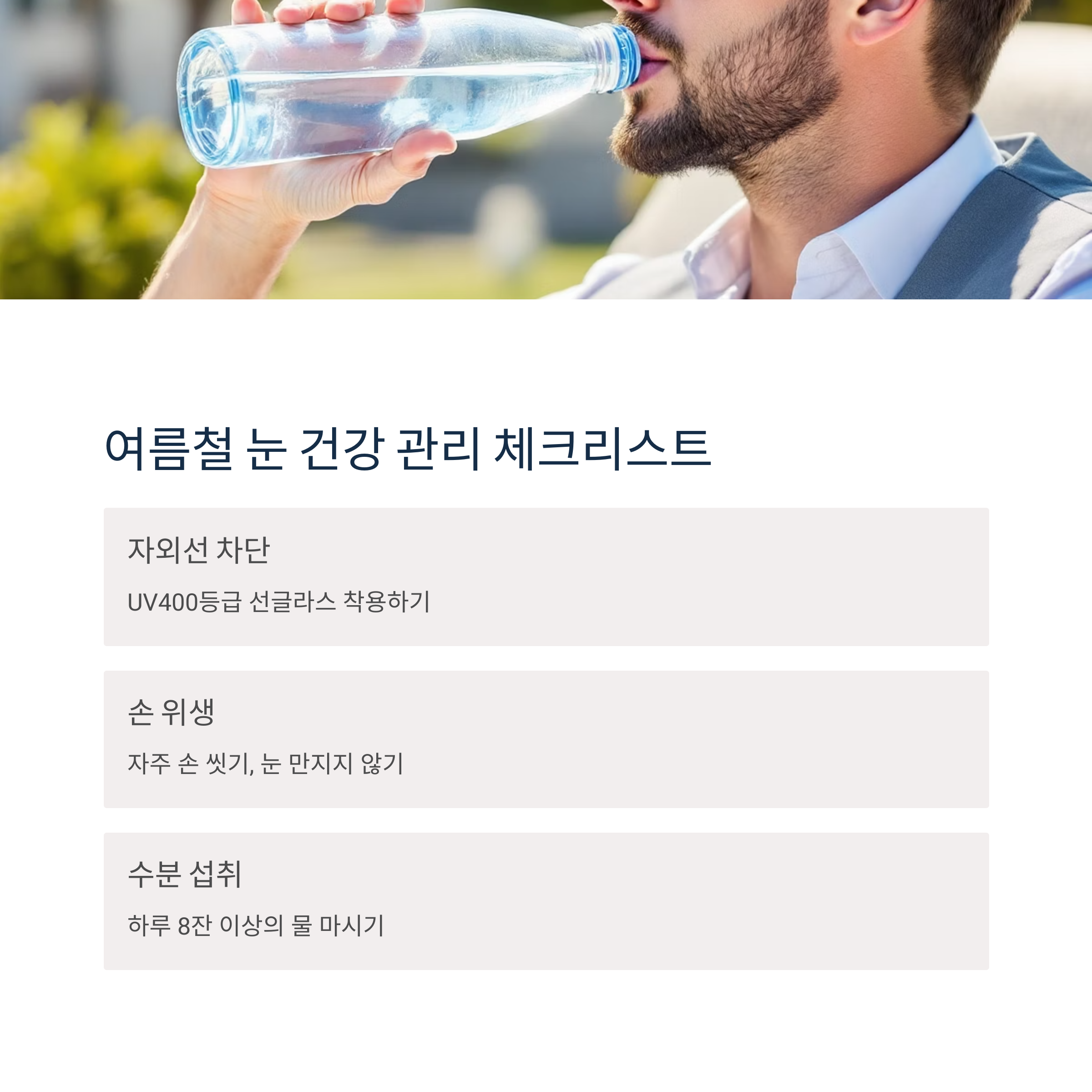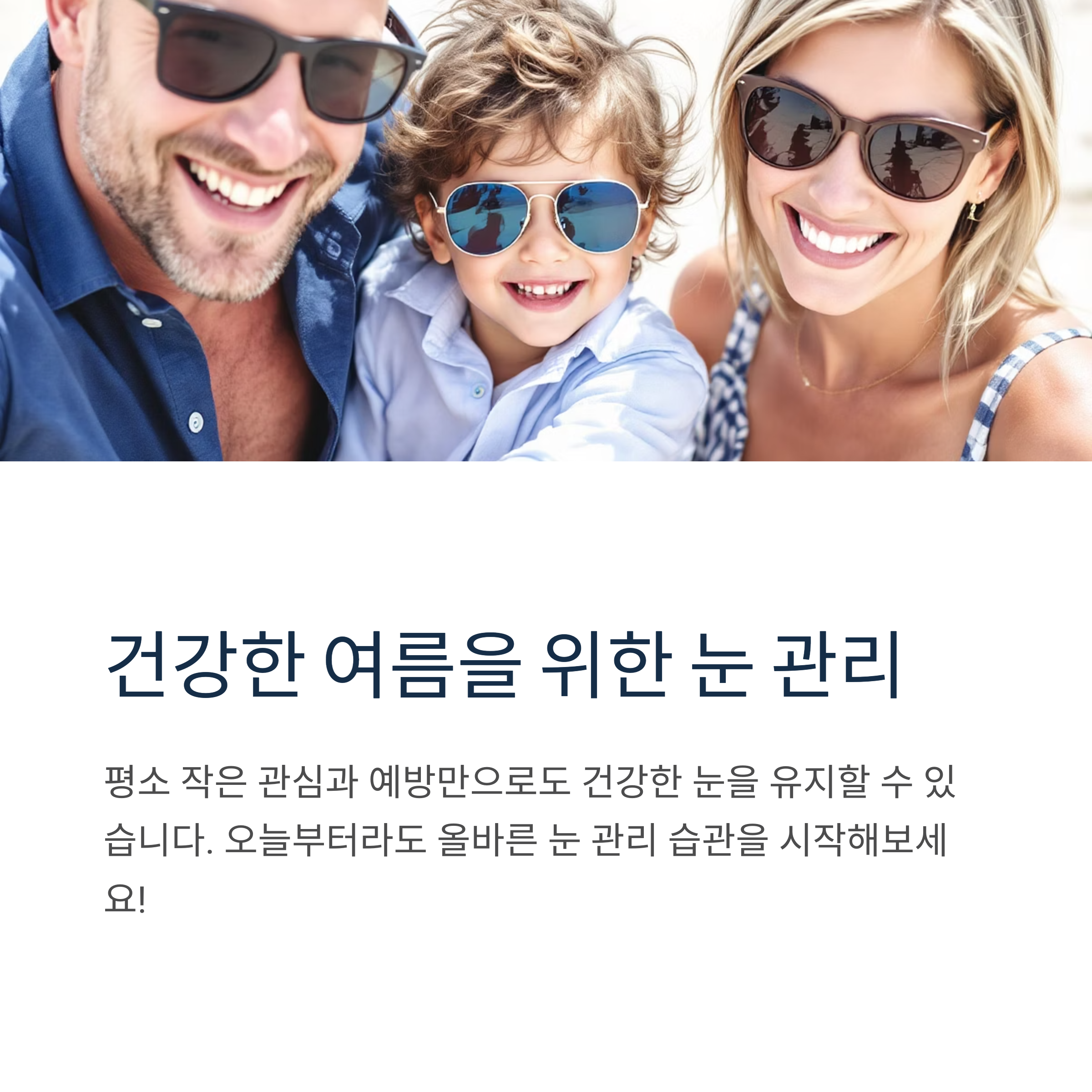여름철 눈 건강은 한 번 손상되면 회복이 어려운 경우가 많습니다. 평소 작은 관심과 예방만으로도 건강한 눈을 유지할 수 있으니, 오늘부터라도 올바른 눈 관리 습관을 시작해보세요.