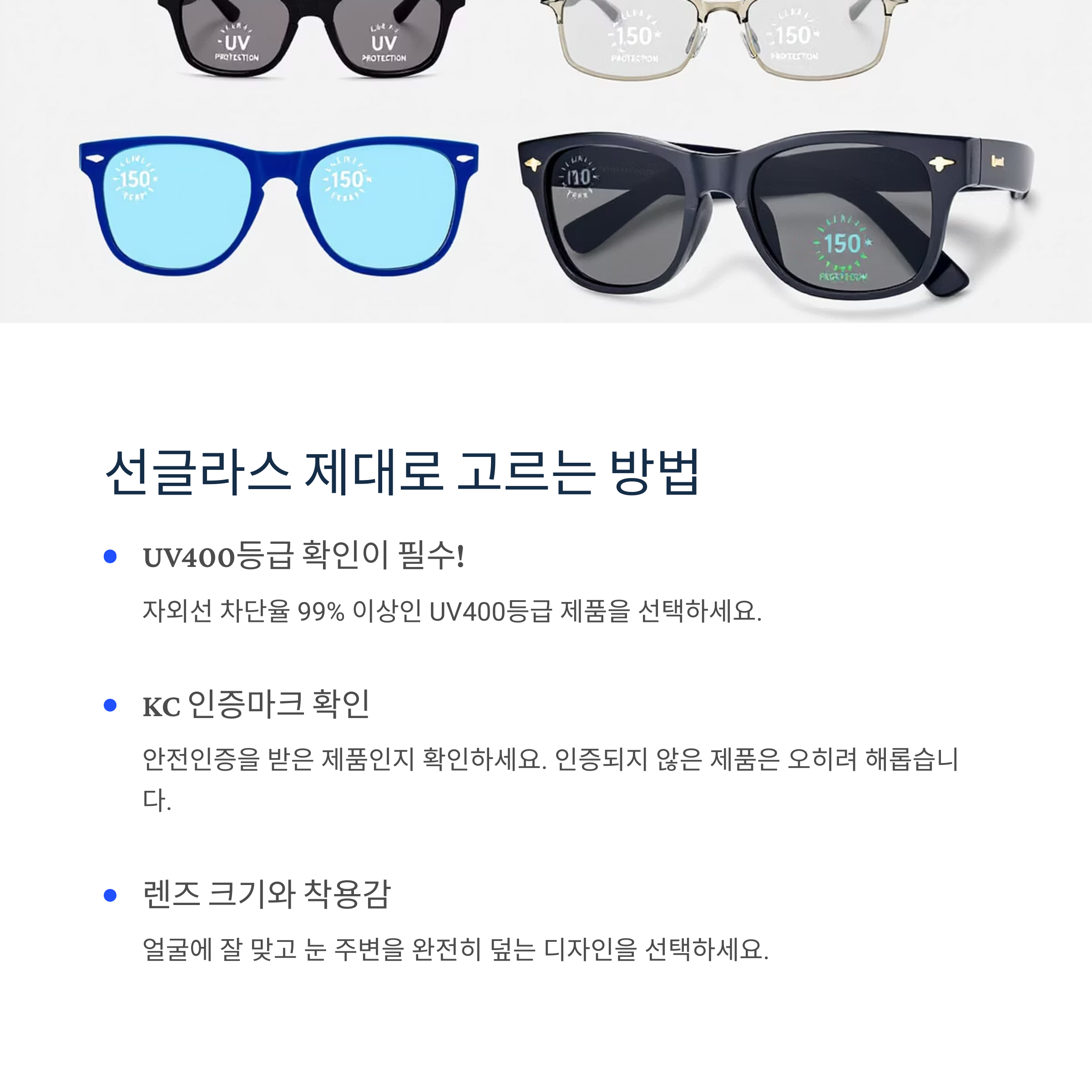 단순히 색이 진한 선글라스가 좋은 게 아닙니다. 반드시 자외선 차단율 99% 이상인 UV400등급 제품을 선택해야 합니다.