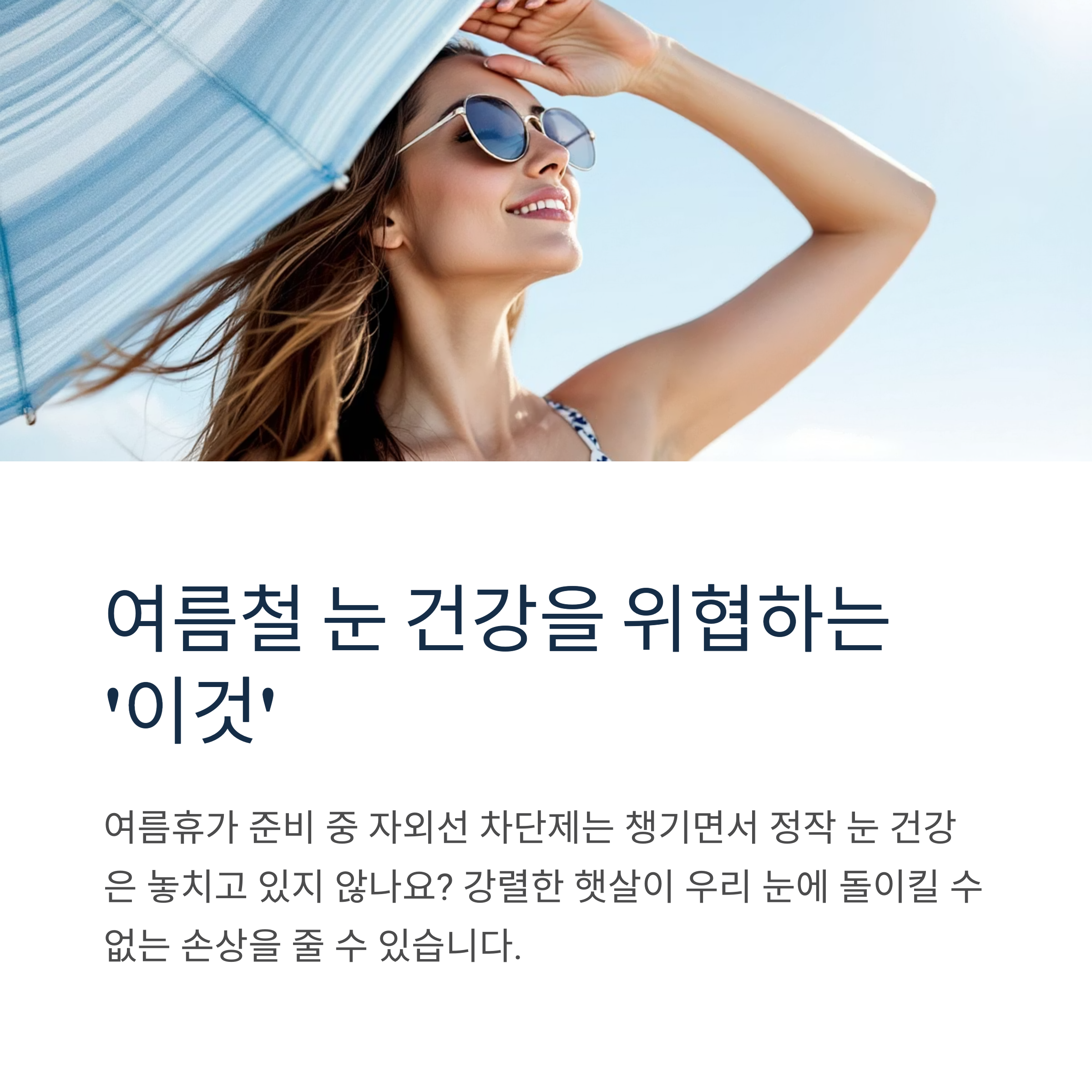 여름휴가를 앞두고 자외선 차단제는 챙기면서 정작 눈 건강은 놓치고 있지 않나요? 강렬한 여름 햇살이 피부만 태우는 게 아닙니다. 자외선은 우리 눈에 돌이킬 수 없는 손상을 가할 수 있어 각별한 주의가 필요합니다.