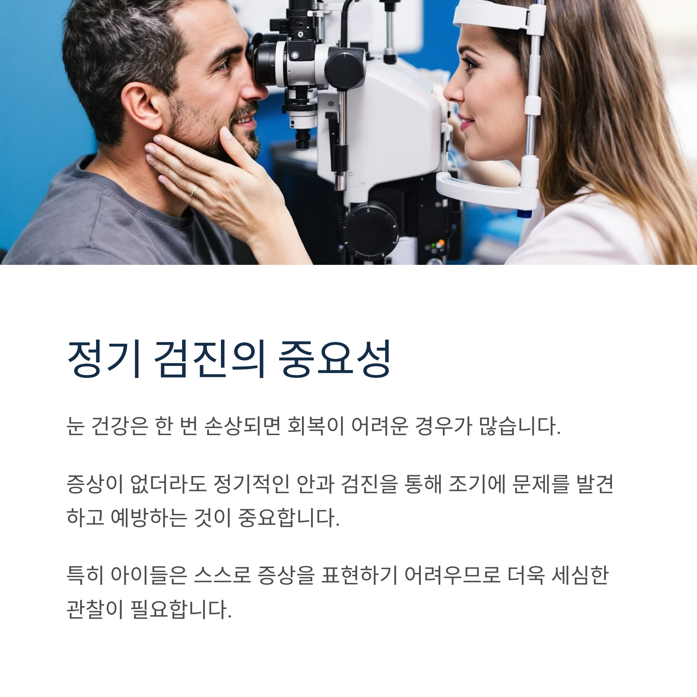 - 정기 검진: 이상 증상 시 즉시 안과 방문