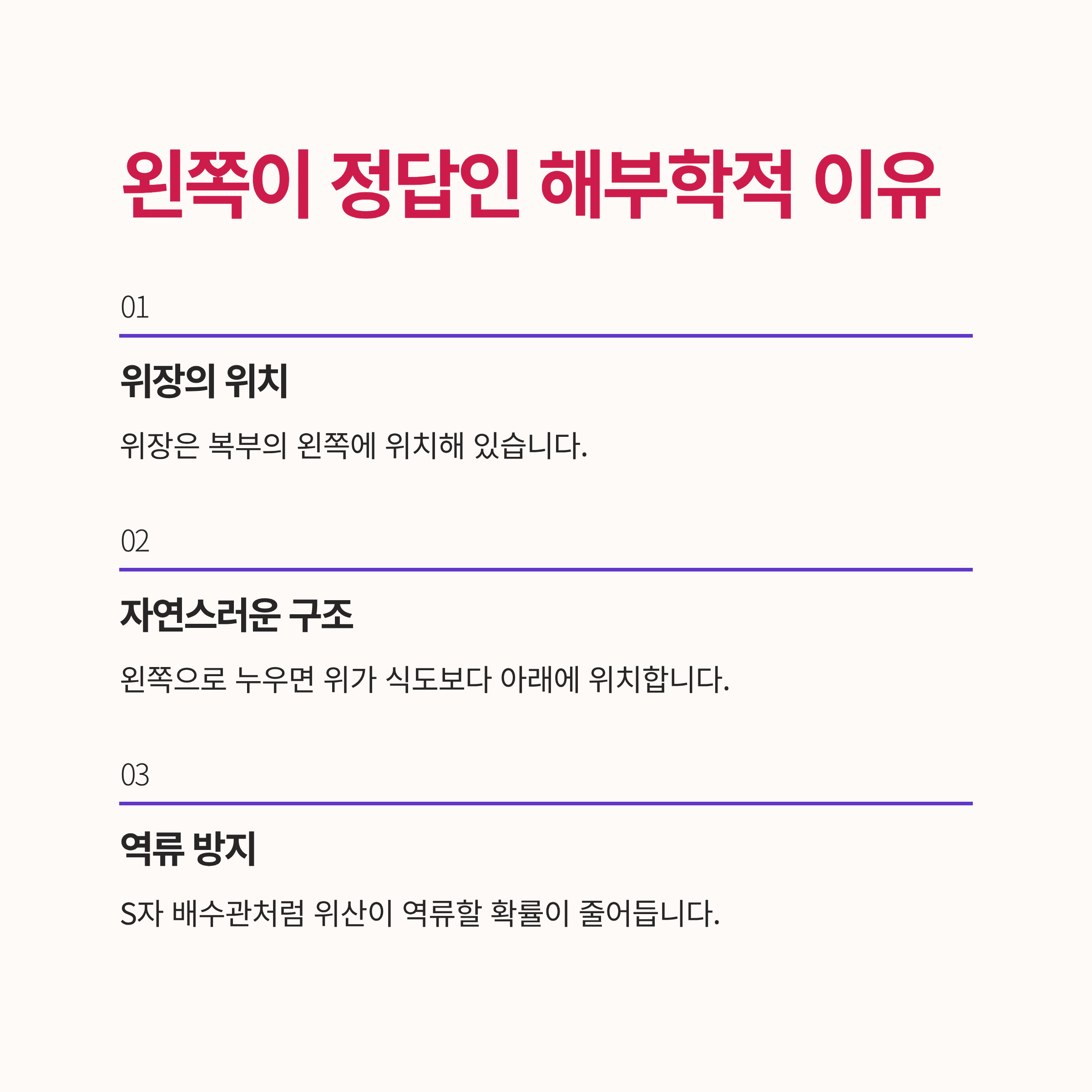 위장은 복부의 왼쪽에 위치해 있으며, 그 위에 식도가 연결되어 있습니다. 왼쪽으로 누우면 위가 식도보다 아래에 위치하게 되어 위산이 역류할 확률이 줄어듭니다. 마치 세면대의 S자 배수관처럼 자연스러운 구조가 만들어지는 것입니다.