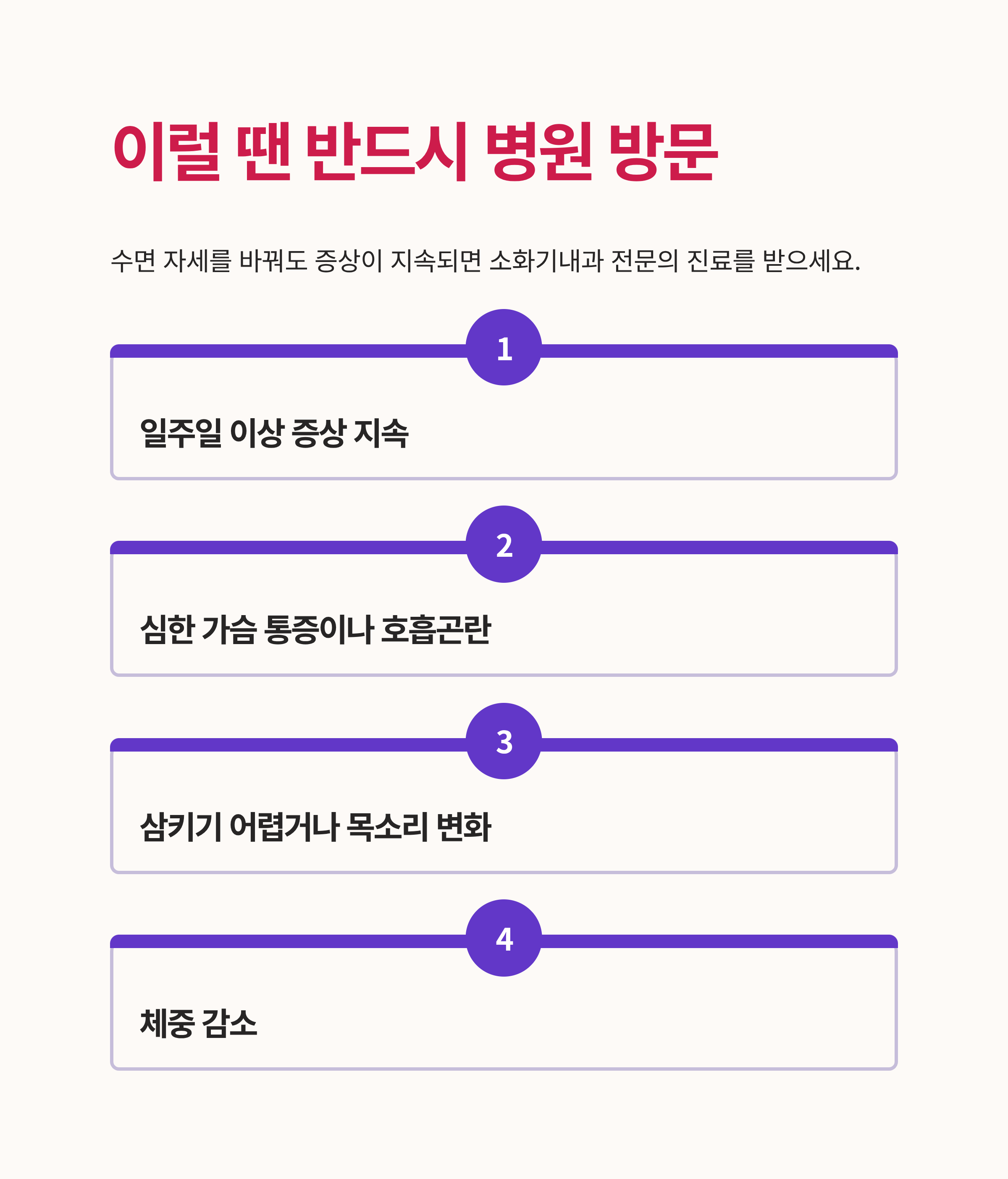 수면 자세를 바꿔도 증상이 지속되거나 다음과 같은 경우에는 반드시 소화기내과 전문의의 진료를 받아야 합니다: