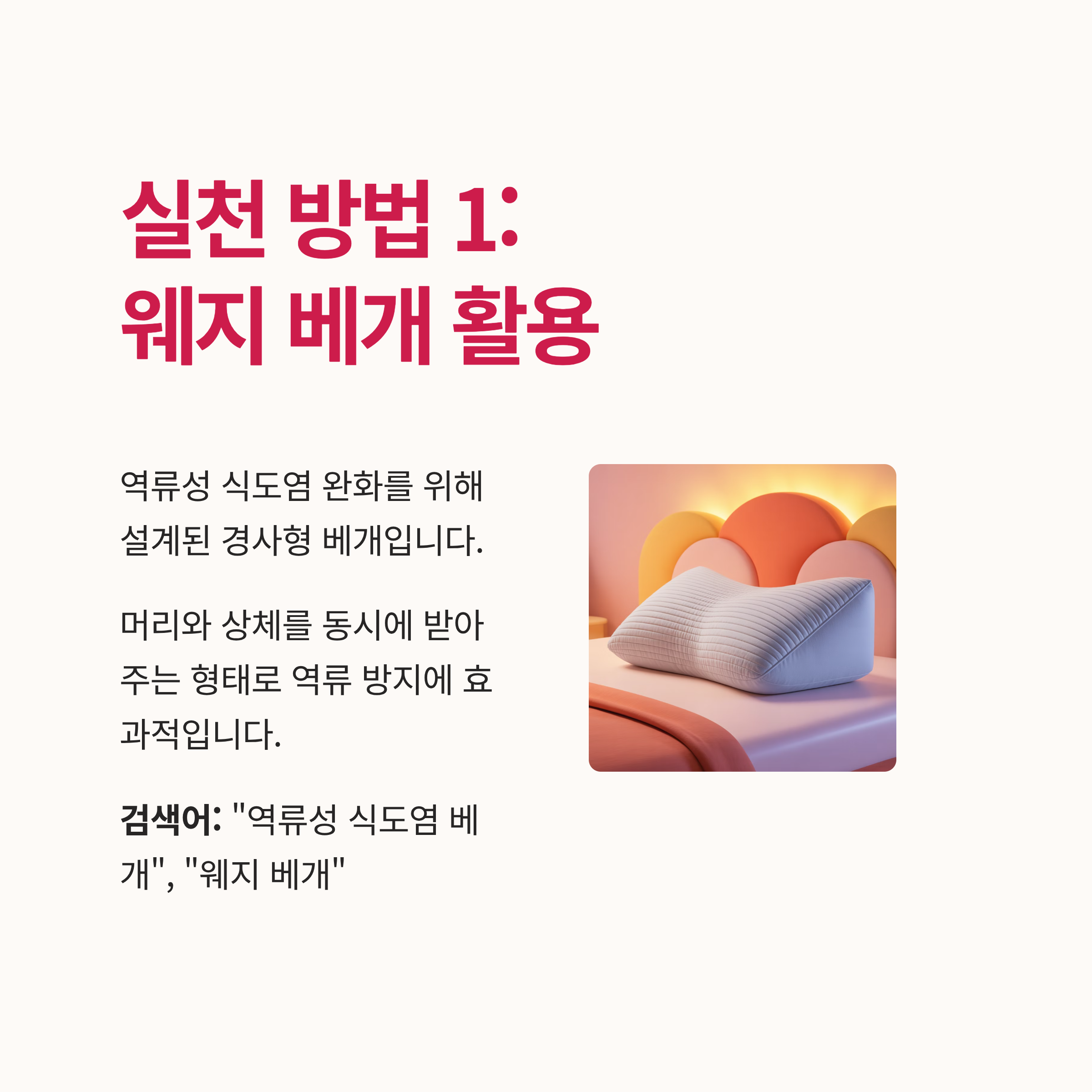 역류성 식도염 완화를 목적으로 설계된 웨지 베개는 일반 베개와 달리 머리와 상체를 동시에 받아주는 형태라 역류 방지에 효과적입니다. 시중에서 "역류성 식도염 베개", "웨지 베개"로 검색하면 쉽게 구매할 수 있습니다.