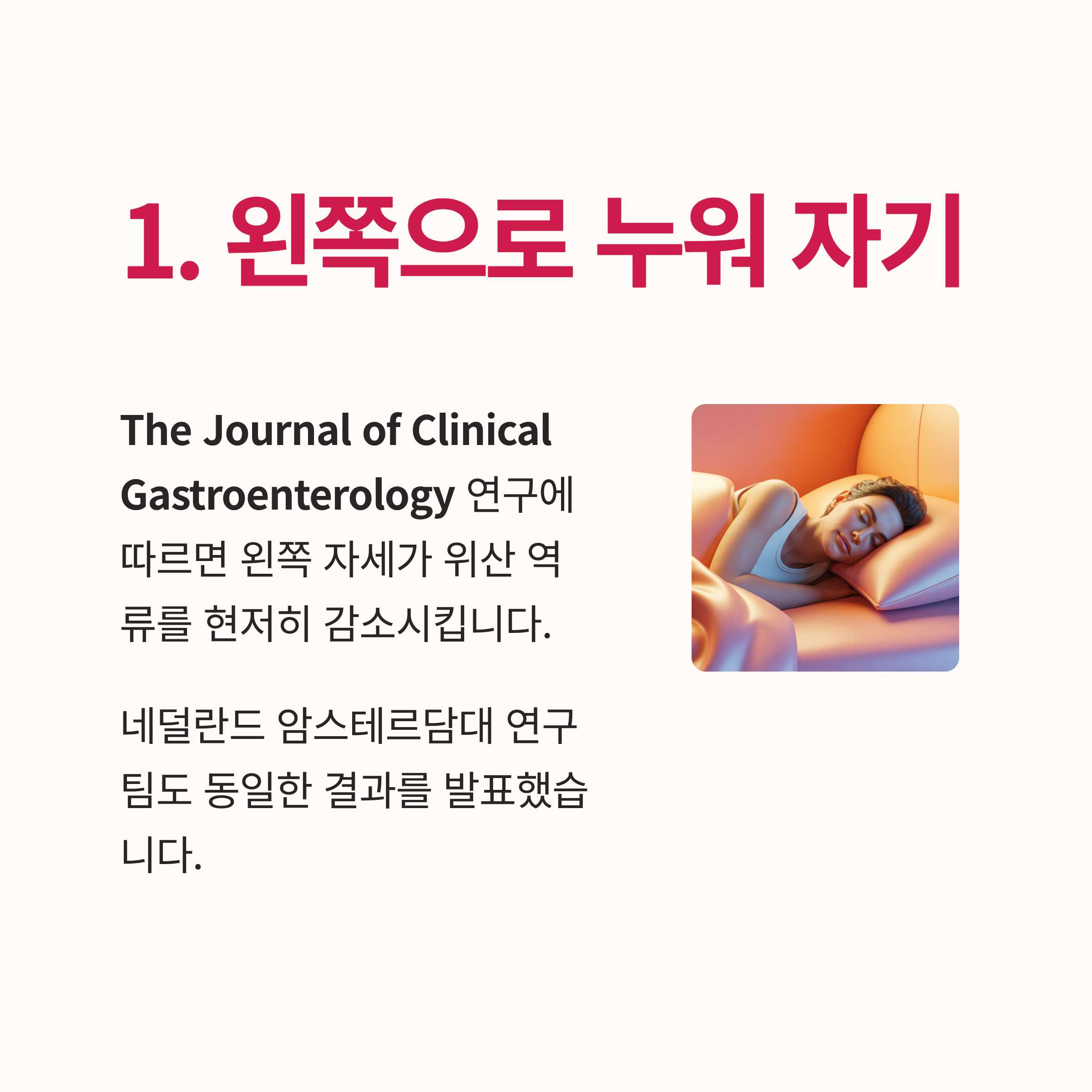 The Journal of Clinical Gastroenterology 연구에 따르면, 왼쪽 자세로 눕는 것이 위산 역류를 현저히 감소시킨다고 보고되었습니다. 미국 위장병학 저널에 발표된 네덜란드 암스테르담대 연구팀의 연구에서도 왼쪽으로 누워 자면 역류성 식도염을 완화할 수 있다는 결과가 나왔습니다.